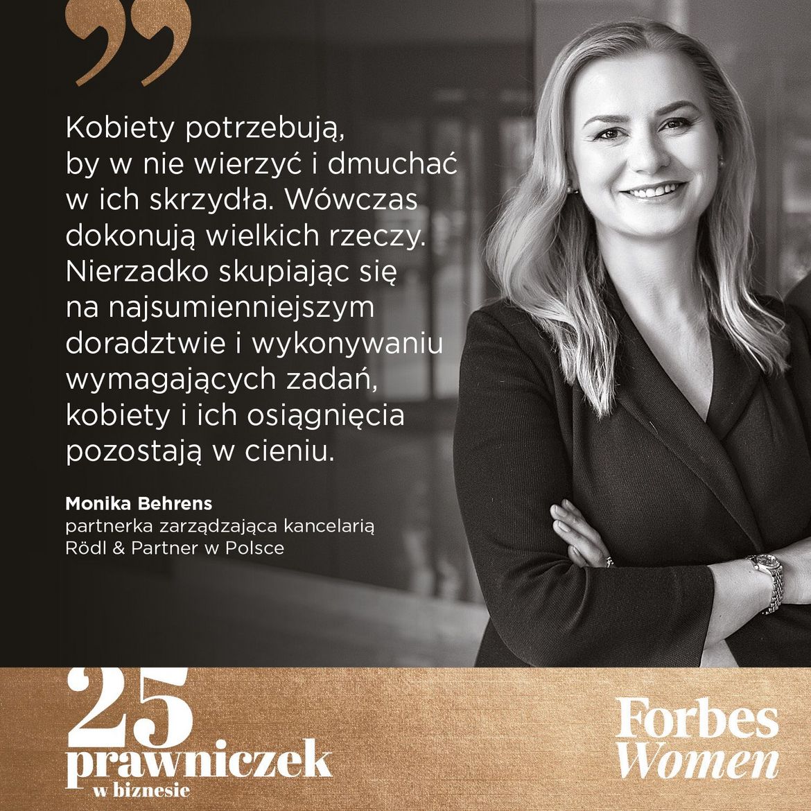 Dr. iur. Monika Behrens, radca prawny i Partner współodpowiedzialny za dział doradztwa prawnego w Rödl & Partner w Polsce znalazła się wśród wyróżnionych kobiet na liście 25 najwybitniejszych prawniczek w biznesie. Raport powstał z inicjatywy Forbes Women Polska oraz Fundacji Women in Law.