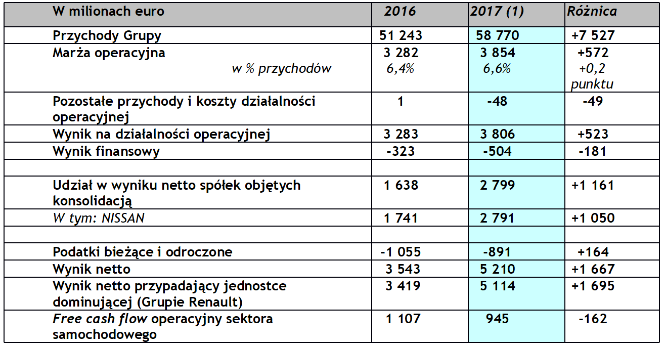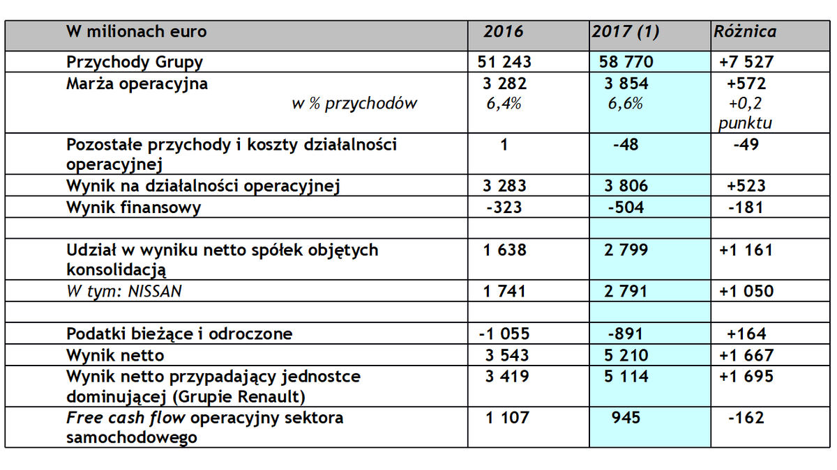 <p style="text-align: justify;">Wzrost sprzedaży o 8,5% do poziomu 3,76 miliona samochodów. Wzrost obrotów Grupy o 14,7% do 58,77 miliarda euro. Bez uwzględnienia konsolidacji AwtoWAZ, obroty wzrosły o 9,4%(1)). Marża operacyjna Grupy zamknęła się kwotą 3,854 miliona euro, co stanowi 6,6% przychodów. Bez uwzględnienia konsolidacji AwtoWAZ, marża operacyjna wzrosła o 15,8% do poziomu 3,799 miliarda euro (6,8% obrotów w porównaniu do 6,4% w 2016 roku). Wynik na działalności operacyjnej Grupy wyniósł 3,806 miliarda euro (+15,9%) w porównaniu do 3,283 miliarda euro w 2016 roku. Wynik netto wyniósł 5,210 miliarda euro (+47,1%) w porównaniu do 3,543 miliarda euro poprzednio. Bez uwzględnienia przychodów nadzwyczajnych Nissana wynik netto wynosi 4,189 miliarda euro (+18,2%). Dodatni free cash flow operacyjny w sektorze samochodowym w wysokości 945 milionów euro.</p>