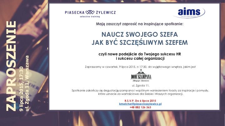 <p style="text-align: justify;">Piasecka & Żylewicz Selective Trainig oraz Aims International zapraszają na inspirujące spotkanie "Naucz swojego szefa jak być szczęśliwym szefem" - czyli nowe podejście do Twojego sukcesu HR i sukcesu całej organizacji. Spotkanie dedykowane jest Managerom i Dyrektorom działów HR.</p>