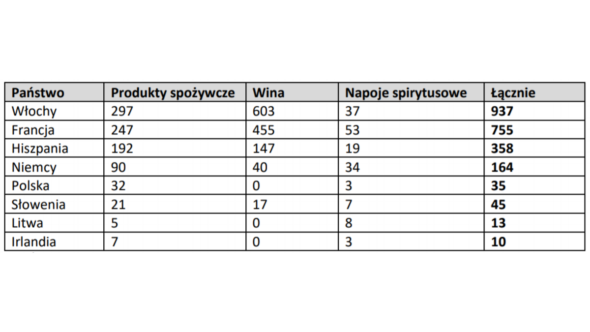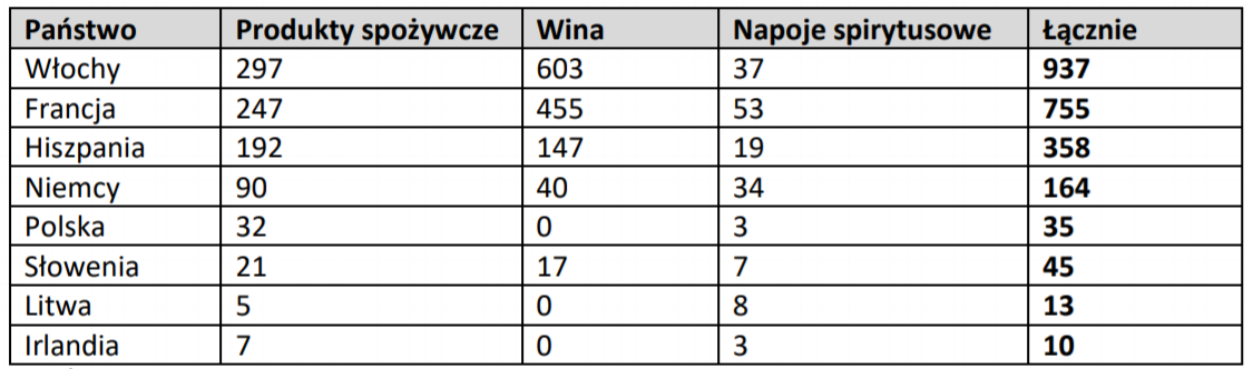 Źródło: Bazy danych Komisji Europejskiej (DOOR database, e-Bacchus database, e-spirit-drinks database)