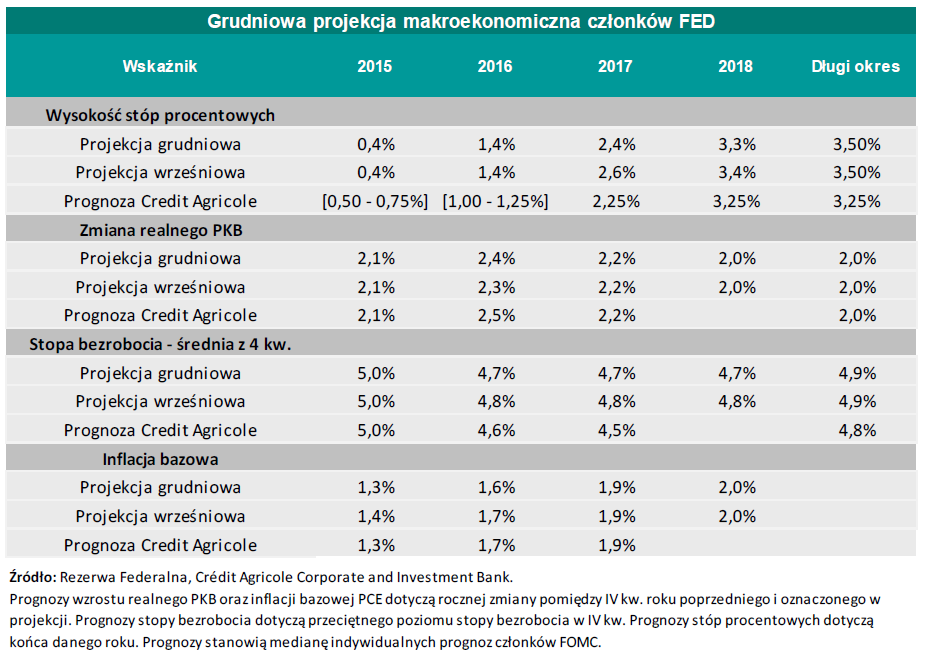 Opublikowane zostały także grudniowe projekcje makroekonomiczne członków FED. W porównaniu do wrześniowej projekcji prognoza tempa wzrostu gospodarczego w 2016 r. zwiększyła się do 2,4% wobec 2,3%. Ścieżka dynamiki PKB w latach 2017-2018 pozostała niezmieniona. Zgodnie z grudniow? projekcj? stopa bezrobocia w latach 2016-2018 ustabilizuje się na poziomie ok. 4,7%. (o 0,1 pkt. proc. niżej niż w projekcji wrześniowej). FED utrzymał jednocześnie oszacowanie naturalnej stopy bezrobocia na poziomie 4,9%. Nieznacznie zrewidowana w dół (o 0,1 pkt. proc.) została ścieżka inflacji bazowej w latach 2015-2016, co wynika z uwzględnienia negatywnego wpływu umocnienia dolara na ceny dóbr importowanych. Podobnie jak we wrześniowej projekcji, cel inflacyjny zostanie osi?gnięty w 2018 r.