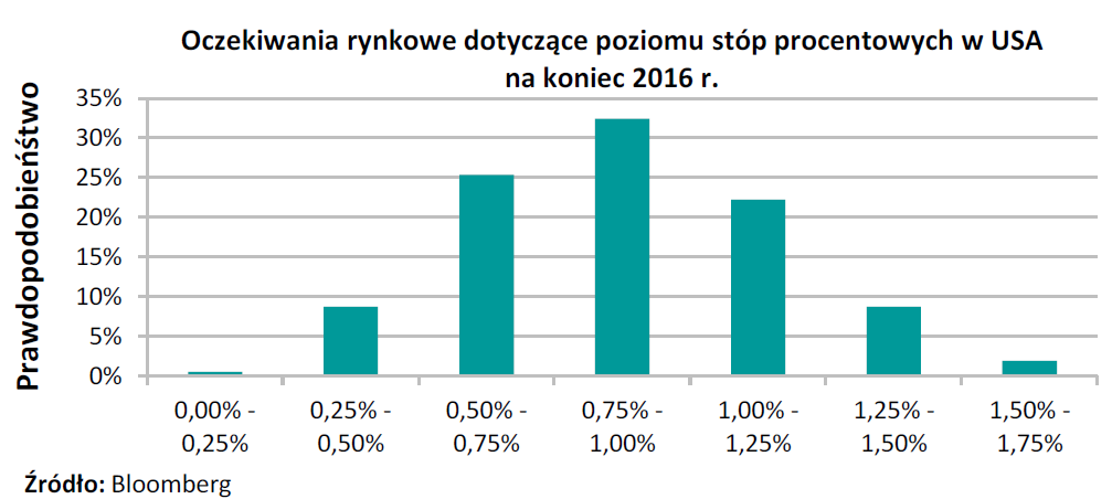 W świetle powyższych informacji pewnym zaskoczeniem jest zaprezentowana w grudniowej projekcji mediana oczekiwań członków FED dotycz?cych poziomu stopy procentowej na koniec 2016 r., która pozostała niezmieniona w porównaniu do wrześniowej projekcji (1,375%). Takie oczekiwania członków FED s? spójne z podwyżkami stóp procentowych o ł?cznej skali równej 100 pb w 2016 r. Zapowiedź prowadzenia łagodnej polityki pieniężnej potwierdza natomiast obniżenie ścieżki oczekiwanego poziomu stóp procentowych (mediany prognoz członków FED) o 20 pb w 2017 r. i 10 pb w 2016 r.