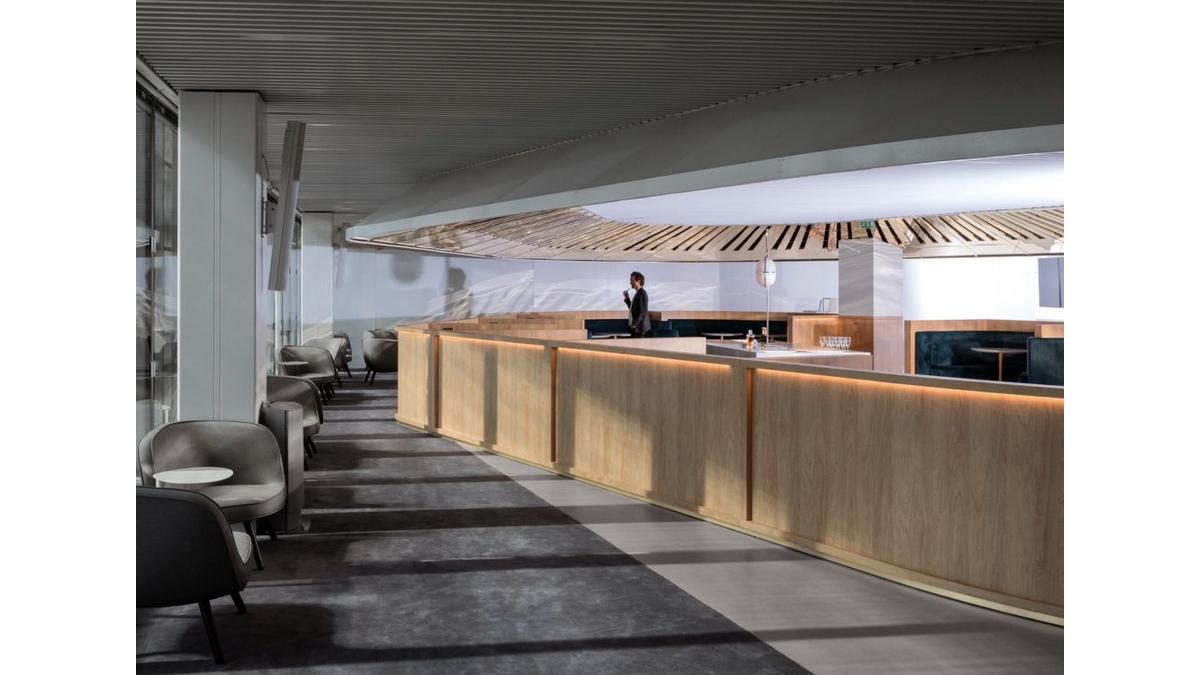 Air France powierzyło renomowanemu francuskiemu projektantowi Mathieu Lehanneurowi stworzenie baru, w którym czas wydaje się stać w miejscu. Położony w samym sercu nowego salonu Air France bar „balkon” ma powierzchnię 160 metrów kwadratowych. Dzięki niezwykłemu projektowi goście maj? wrażenie, że s? „zawieszeni” między niebem, a ziemi?, w pomieszczeniu o zakrzywionej strukturze , osłoniętym złotym, lustrzanym sufitem. W centrum pomieszczenia znajduje się bar, a dalej umieszczono komfortowe miejsca siedz?ce dla gości, które zaprojektowano na wzór półokr?głych loży. Loże s? wyłożone niebieskim aksamitem ścian i dodatkowo ozdobione haftowanymi numerami. Wewn?trz każdej z nich znajduje się duża sofa oraz stolik na cokole, wyposażony w gniazdka elektryczne.