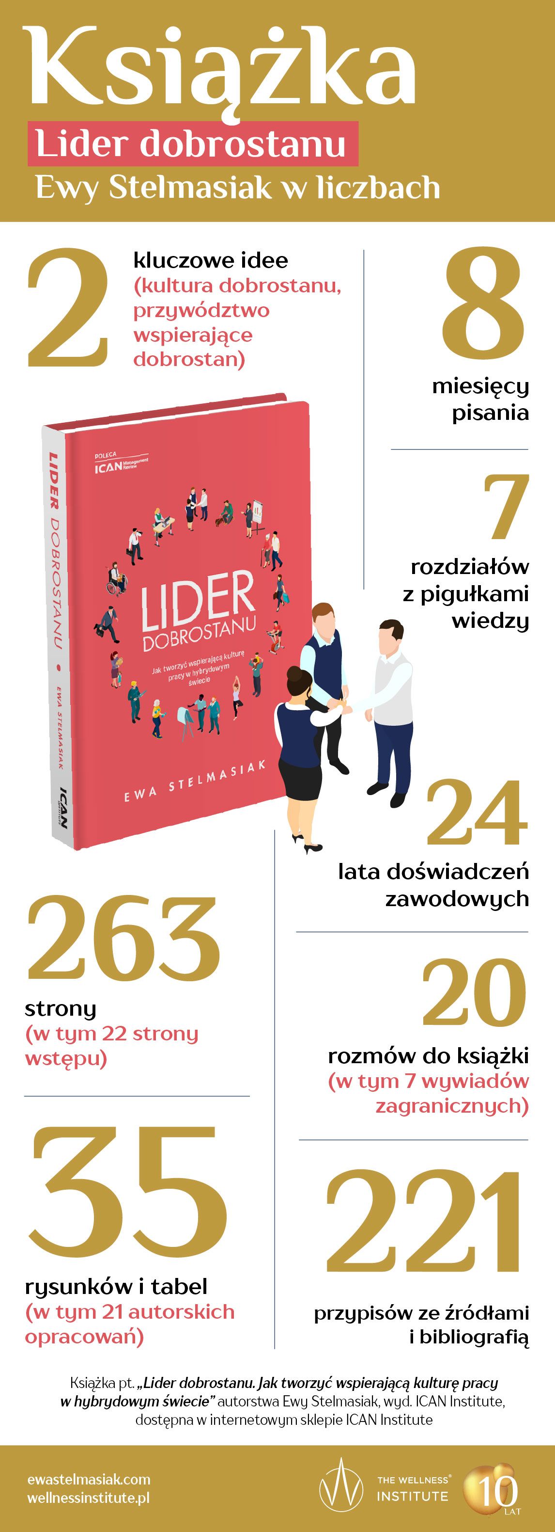 Ewa Stelmasiak jest pionierką wellness w Polsce. Szkoliła się u czołowych amerykańskich twórców ruchu wellness, z którymi współpracuje do dzisiaj. Jej książka „Lider dobrostanu. Jak tworzyć wspierającą kulturę pracy w hybrydowym świecie” to pierwsza pozycja na rynku polskim zawierająca wiedzę oraz doświadczenia praktyków biznesu, a także analizująca zjawiska związane z well-beingiem, wellness oraz dobrostanem. Publikacja jest przeznaczona w szczególności dla liderów w organizacji, którzy mają realny wpływ na budowanie dobrostanu, choć będzie również inspiracją dla wszystkich osób, które dbając o zaangażowanie, motywację, zdrowie i satysfakcję Pracowników, pragną też zadbać po prostu o siebie.
