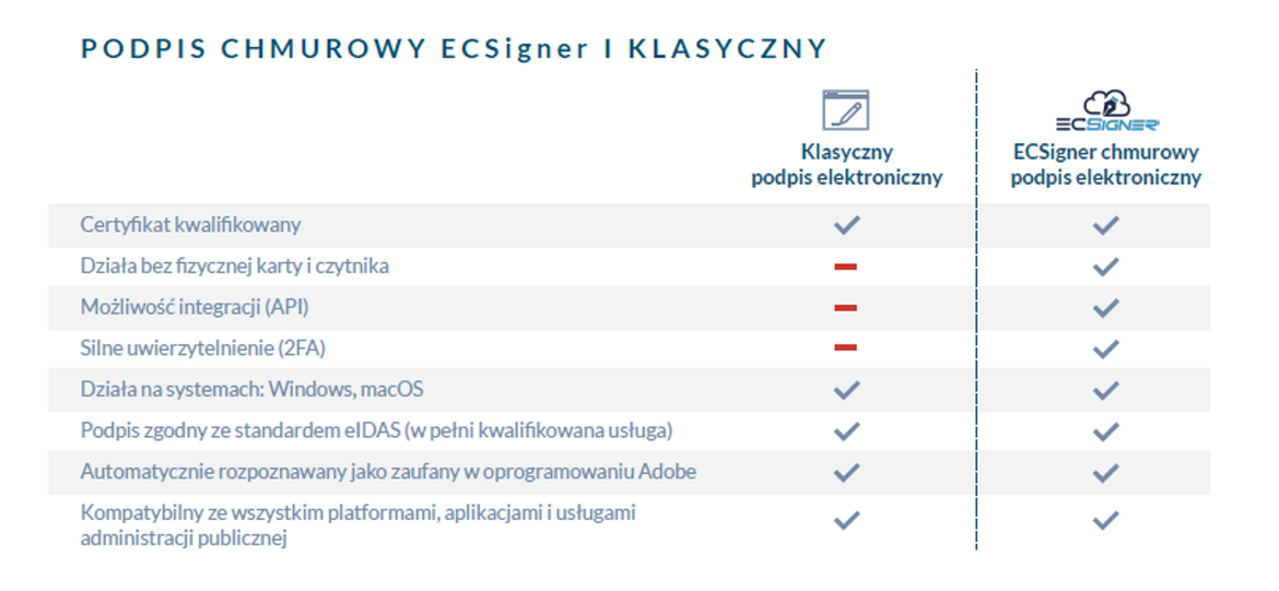 ECSigner to podpis chmurowy zgodny z trendem przechodzenia na usługi cloudowe. To najnowocześniejsza wersja kwalifikowanego podpisu elektronicznego. Podpisuje dokumenty bez użycia karty kryptograficznej lub czytnika, a jego zastosowanie jest identyczne jak podpisu kwalifikowanego na fizycznej karcie kryptograficznej. Jego skutki prawne są równoważne podpisowi własnoręcznemu. Jest zgodny z europejskim rozporządzeniem eIDAS oraz z polską ustawą o identyfikacji elektronicznej i usługach zaufania.