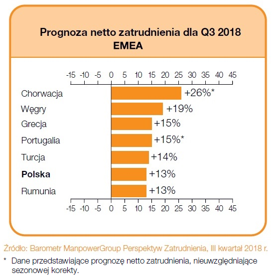 <p style="text-align: justify;">Tak dobrze na polskim rynku pracy nie było od blisko 8 lat – prognoza netto zatrudnienia dla Polski po korekcie sezonowej wynosi +13%. W najbliższym kwartale największe szanse na znalezienie zatrudnienia czekają w produkcji przemysłowej, w budownictwie oraz w sektorze związanym z kopalniami i przemysłem wydobywczym. Wśród sześciu analizowanych regionów najbardziej optymistyczni są pracodawcy z północnej Polski – potwierdza opublikowany dziś raport Barometr ManpowerGroup Perspektyw Zatrudnienia dla III kwartału 2018 roku.</p>