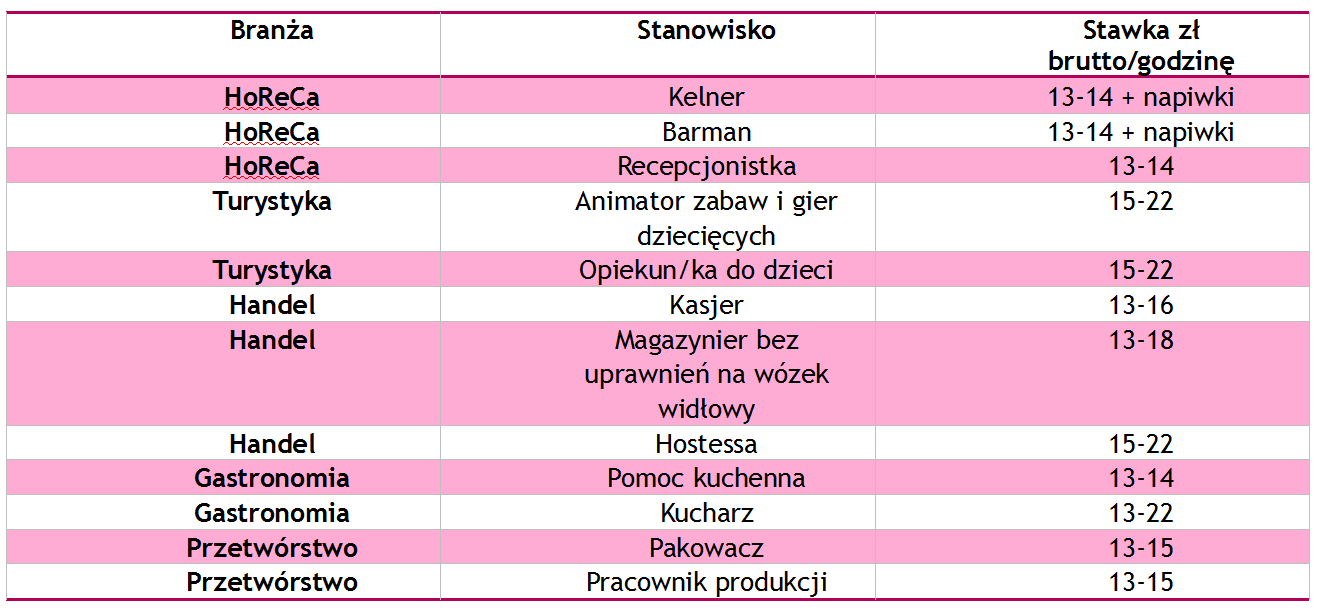Wysokość stawek za godzinę zależy od wielu czynników. Przede wszystkim od rodzaju pracy, doświadczenia pracownika czy regionu Polski, w którym będzie wykonywał pracę. Istotne znaczenie może mieć również długość trwania umowy. W przypadku ofert, w których czas wykonywania pracy trwa np. tylko kilka godzin, zachęt? do podjęcia pracy może być wyższa stawka godzinowa. Tak jest chociażby w przypadku stanowiska hostessy czy animatora gier i zabaw dziecięcych, którzy pracę znajd? najczęściej w weekend w centrach handlowych lub podczas imprez plenerowych. Czas zatrudnienia animatora może się jednak wydłużyć, jeżeli rozejrzy się za ofertami w hotelach i pensjonatach zlokalizowanych w miejscowościach turystycznych, które w swojej ofercie bardzo często maj? animacje dla dzieci. W sezonie turystycznym atrakcyjne wynagrodzenie otrzymaj? pracownicy zatrudniani w gastronomii i w hotelarstwie. Mimo, że kelnerzy, barmani, pomoce kuchenne czy pracownicy recepcji bardzo często otrzymuj? minimalne wynagrodzenie w wysokości 13 zł brutto za godzinę, bardzo często uzyskuj? również dodatkowe gratyfikacje w postaci napiwków, procentu od utargu b?dź zakwaterowania.
