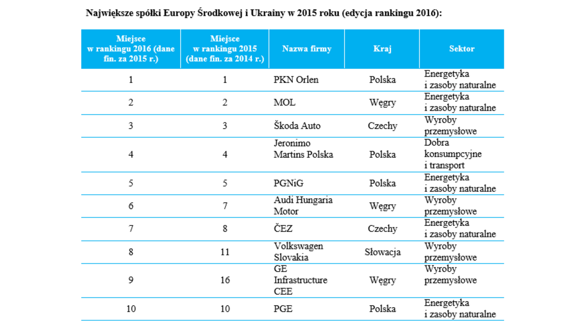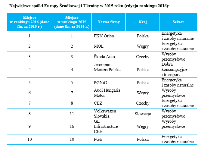 W rankingu podsumowuj?cym 2015 r. aż 66,6 proc. przedsiębiorstw zanotowało lepsze wyniki niż rok wcześniej (w 2014 było to 52 proc.). Największ? spółk? Europy Środkowej pozostaje PKN Orlen, który pod względem przychodów dystansuje węgierski MOL o prawie 8 mld euro. Polski gigant zanotował jednak spadek przychodów o 17,2 proc., a jego konkurent o 15,6 proc.„Obserwowane od dwóch edycji rankingu spadki w branży zasobów naturalnych s? wynikiem spadaj?cych cen ropy naftowej na światowych rynkach. W efekcie tych spadków oraz w poł?czeniu ze wzrostem w branży motoryzacyjnej zmniejsza się dystans pomiędzy MOL i ? koda Auto” – wyjaśnia Patryk Darowski,Wicedyrektor w Dziale Doradztwa Finansowego Deloitte. „W pierwszej dziesi?tce pojawiły się dwa nowe podmioty: Volkswagen Slovakia i GE Infrastructure CEE z Węgier, które zast?piły ukraiński Metinvest i polski Lotos” – dodaje. Tuż za pierwsz? dziesi?tk? uplasował się natomiast chorwacki Agrokor, po znacz?cym awansie z 22. pozycji, dzięki przejęciu grupy Mercator.