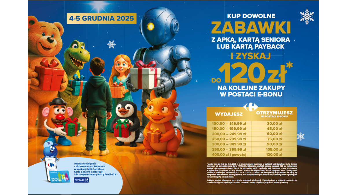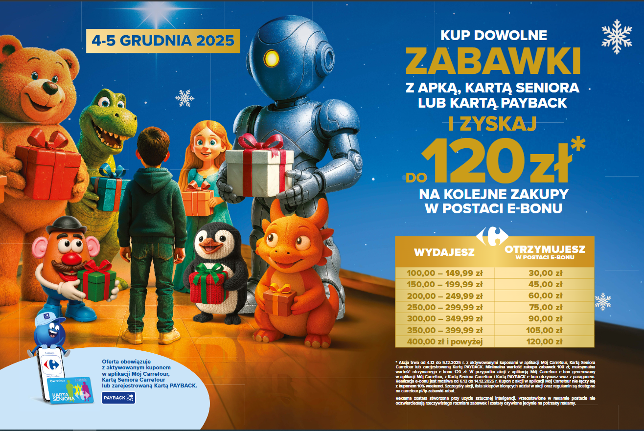 Akcja realizowana jest we wszystkich sklepach własnych Carrefour w Polsce. Aby wziąć w niej udział, posiadacze aplikacji “Mój Carrefour” muszą aktywować dedykowany kupon w aplikacji, natomiast posiadacze Karty Seniora lub zarejestrowanej karty PAYBACK wystarczy, że zeskanują swoją kartę przy kasie. Następnie po dokonaniu zakupu zabawek za minimum 100 zł otrzymamy nawet do 120 zł zwrotu zapłaconej kwoty w e-bonie do wykorzystania na kolejne zakupy.