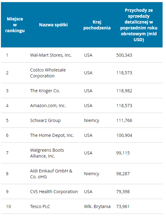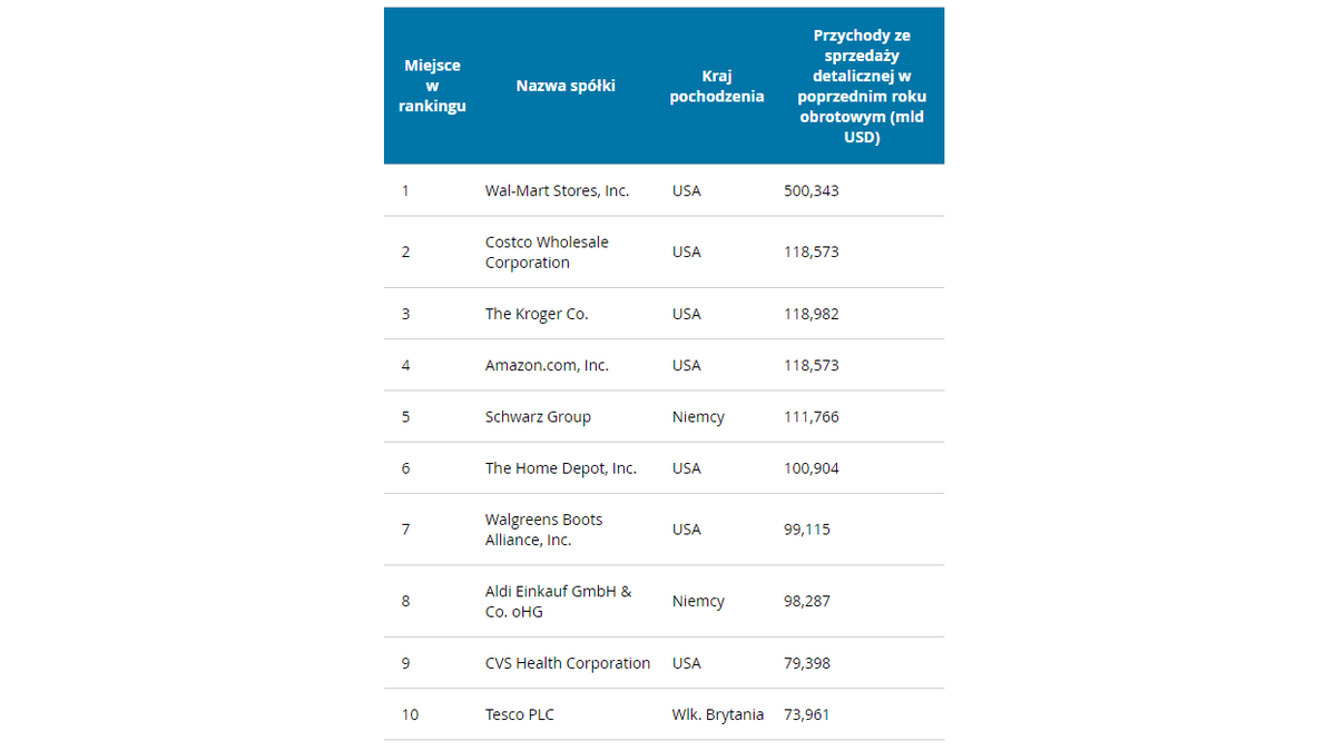 O dwa miejsca spadła sieć drogerii i aptek Walgreens Boots i jest siódmym pod względem wielkości detalist? na świecie. W pierwszej dziesi?tce znaleźli się także Aldi, CVS Health Corporation i – po raz pierwszy w czołówce – Tesco. Brytyjski gigant handlowy odnotował wzrost przychodów o 2,8 proc. rok do roku. Powoli do góry pnie się także Jeronimo Martins. W tym roku właściciel sieci sklepów Biedronka znalazł się na 55. miejscu (rok wcześniej było to 56. miejsce).