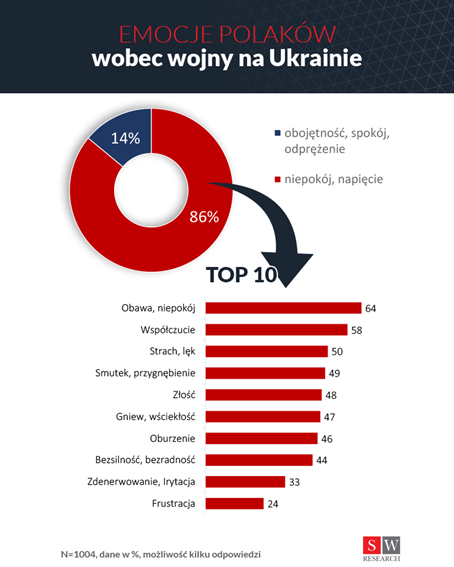 Zdecydowana większość badanych dwa tygodnie po wybuchu wojny odczuwa niepokój i napięcie. W 7-stopniowej skali powiedziało tak pięciu na sześciu badanych. Postawę neutralną wybrała ponad jedna dziesiąta respondentów. Jedynie 2 proc. badanych osób wskazało spokój i odprężenie.