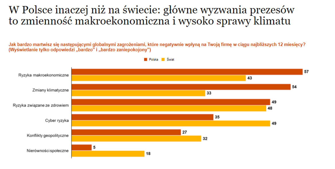 Wśród kluczowych ryzyk, prezesi na świecie na pierwszych miejscach wskazują na wyzwania związane z cyberbezpieczeństwem (ataki hakerów, inwigilacja, dezinformacja) i te dotyczące zdrowia (m.in. COVID-19, obciążenia dla zdrowia psychicznego) - 49% i 48% wskazań. Podobnie było rok wcześniej. Polscy prezesi, inaczej i częściej niż globalni, wśród kluczowych wyzwań wymieniają ryzyka makroekonomiczne (dynamika PKB, wahania bezrobocia i inflacji) i zmiany klimatyczne (odpowiednio 57% i 54% - 1. oraz 2. miejsce na mapie wyzwań), znacznie niżej zaś ryzyka cybernetyczne (35%).