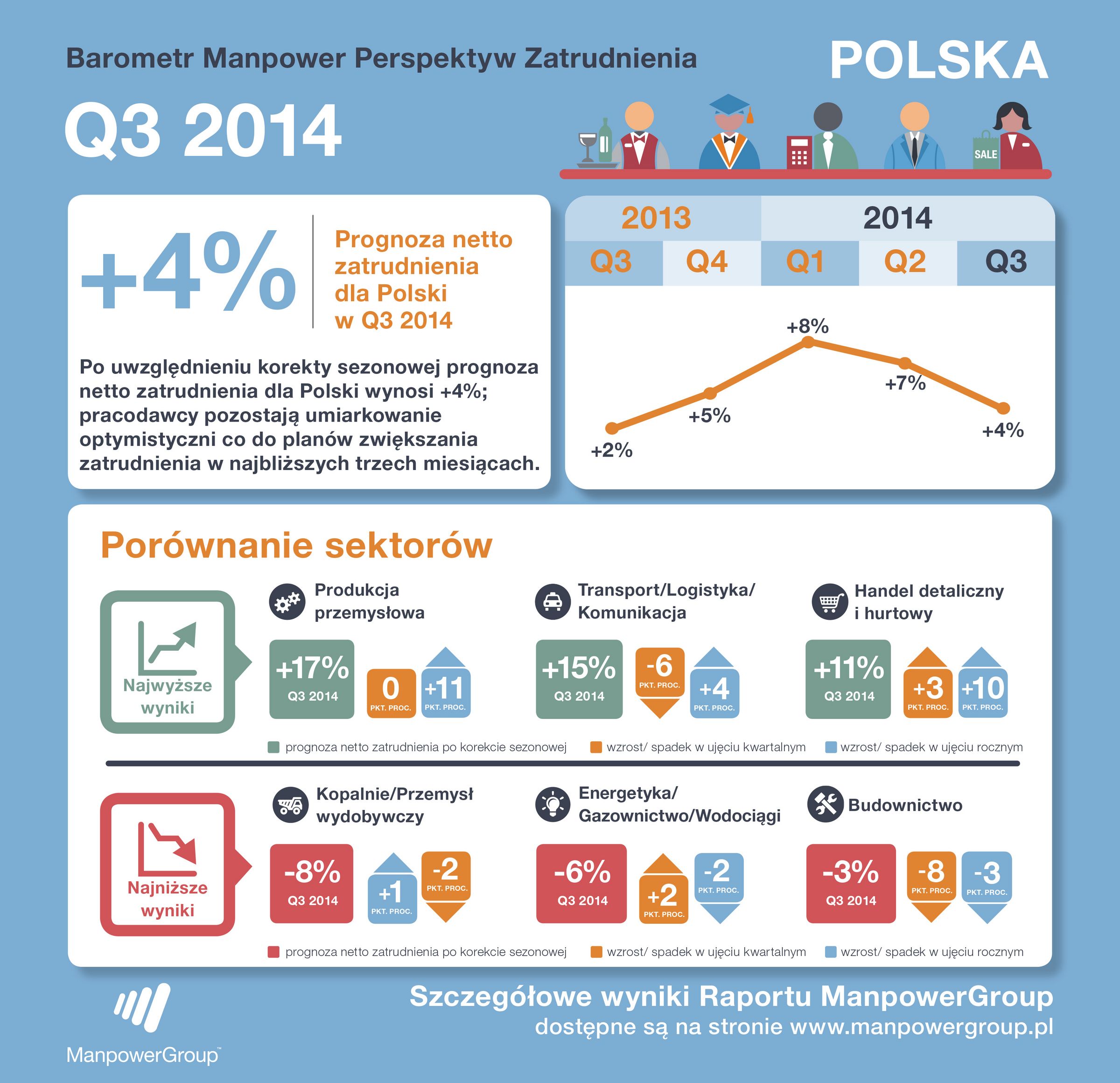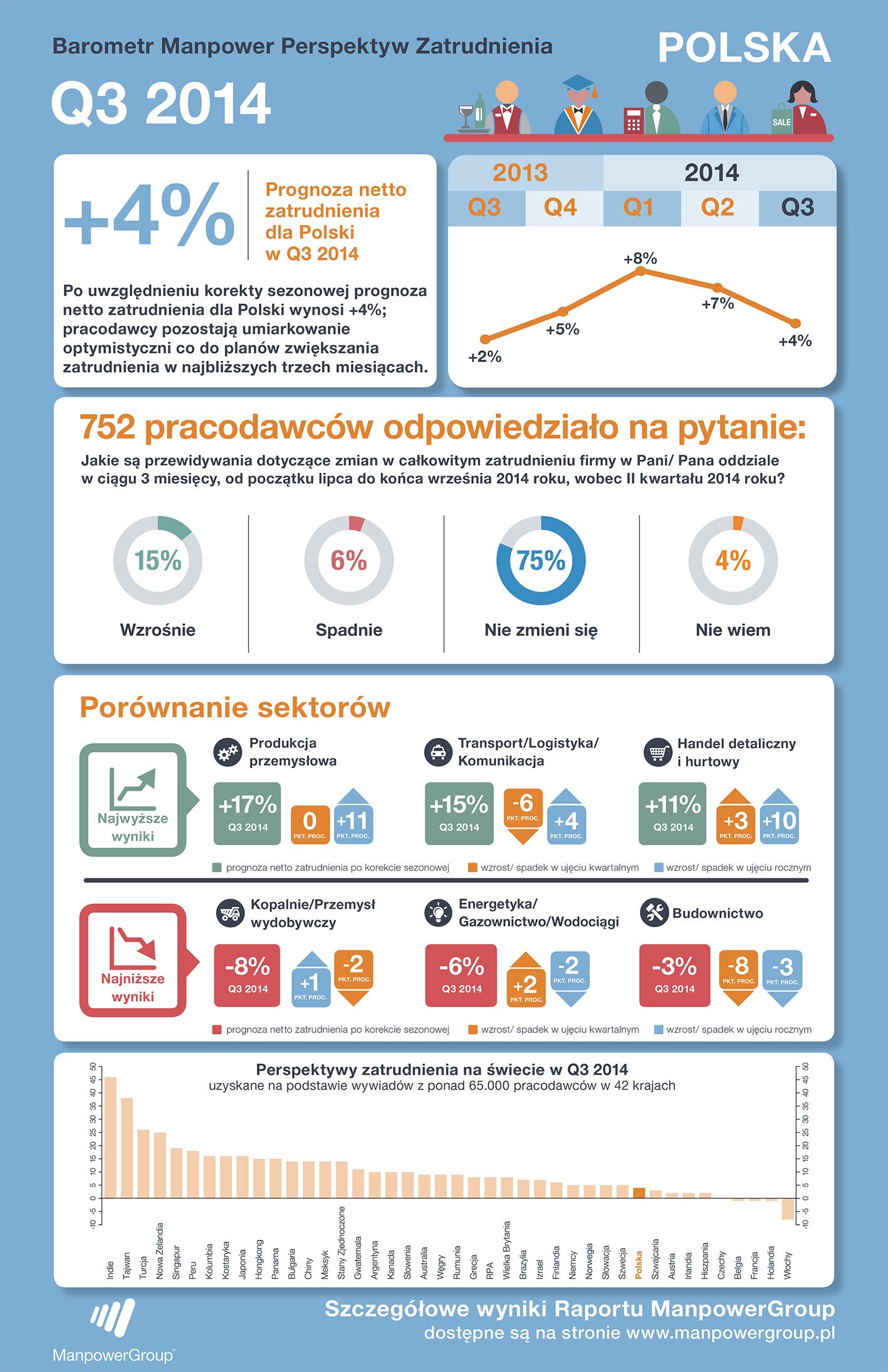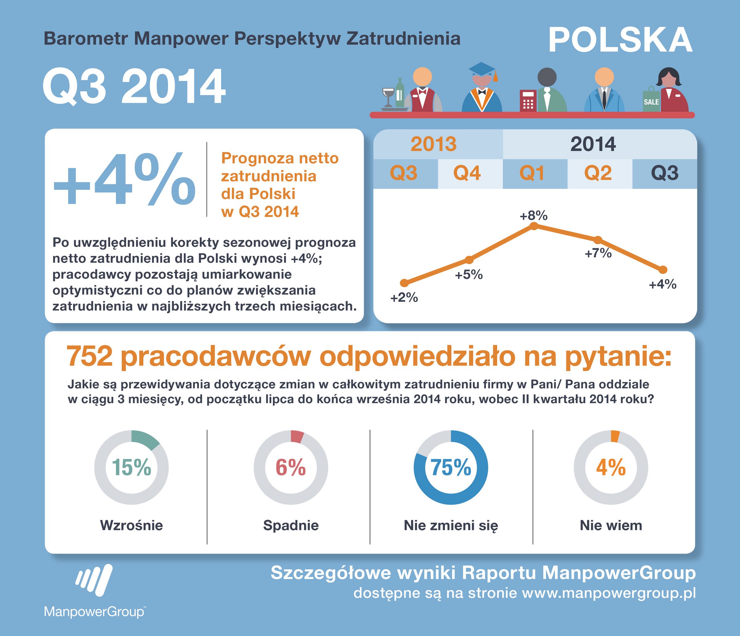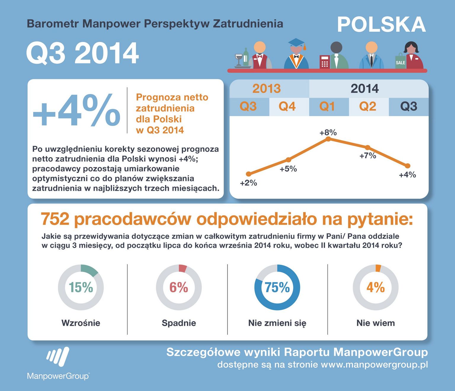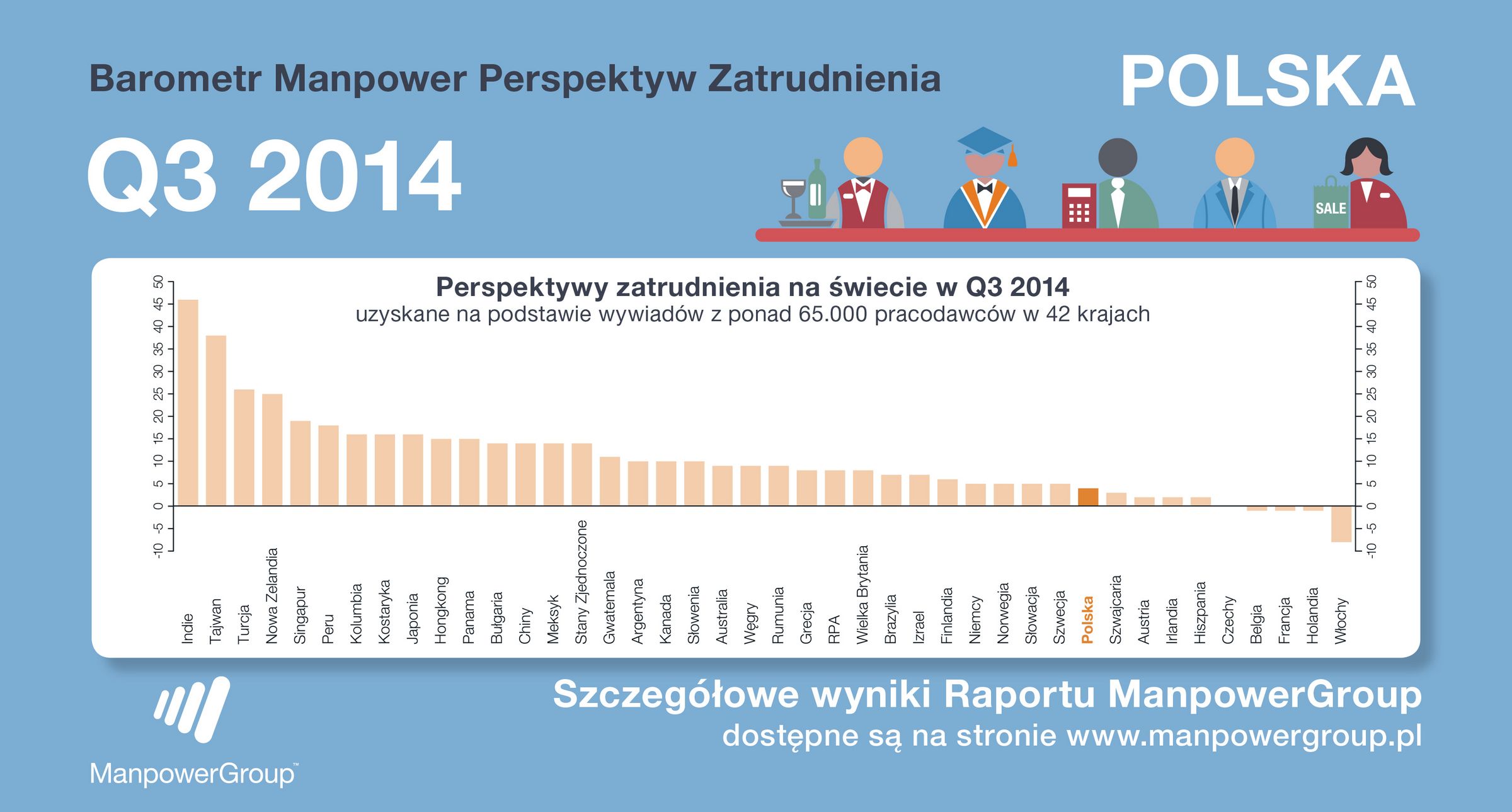 Barometr Manpower Perspektyw Zatrudnienia to kwartalne badanie, które mierzy intencje pracodawców zwi?zane ze zwiększeniem lub zmniejszeniem całkowitego zatrudnienia w ich oddziale w najbliższym kwartale. Badanie jest przeprowadzane od przeszło 50 lat, aktualnie wśród ponad 65 000 pracodawców w 42 krajach i jest jednym z najbardziej wiarygodnych badań rynku pracy na świecie. Raport dla III kwartału 2014 r. został opracowany na podstawie wywiadów indywidualnych przeprowadzonych pomiędzy 17 a 29 kwietnia 2014 r. W Polsce wyniki raportu ManpowerGroup publikowane s? od II kwartału 2008 r. Badanie jest przeprowadzane na reprezentatywnej grupie co najmniej 750 pracodawców.