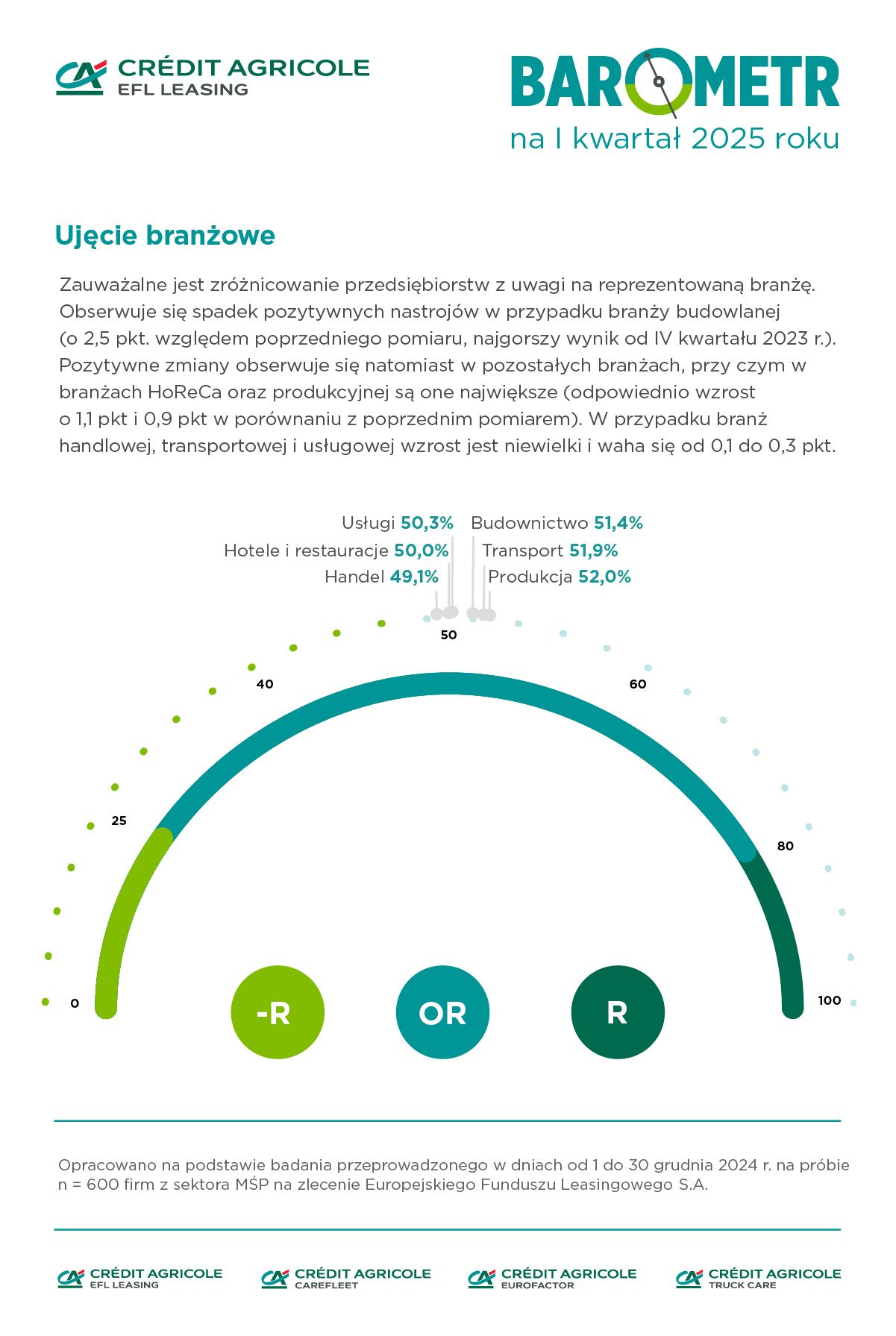 Barometr EFL jest syntetycznym wskaźnikiem informującym o skłonności firm z sektora MŚP do wzrostu (tj. rozwoju rozumianego, jako stawianie sobie przez przedsiębiorstwa celów związanych ze wzrostem sprzedaży i produkcji, ekspansją na nowe rynki i maksymalizacją zysków, co jest związane z inwestycjami w środki trwałe). Prognozowana na dany kwartał kondycja finansowa firm MŚP daje punkt odniesienia do wnioskowania o zakładanym kierunku zmian, które sprzyjają wzrostowi lub działają hamująco na rozwój firm. Badanie przygotowywane jest przez Ecorys na zlecenie Europejskiego Funduszu Leasingowego SA., a jego wyniki są publikowane co kwartał. Jego uczestnicy to mikro, małe i średnie firmy terenu całej Polski. W badaniu wzięła udział reprezentatywna grupa 600 mikro, małych i średnich firm. Aktualna edycja badania odbyła się od 1 do 30 grudnia 2024 roku.