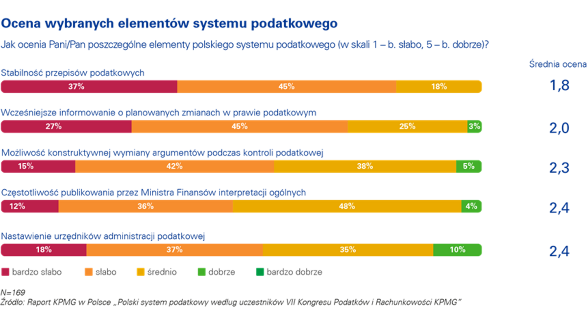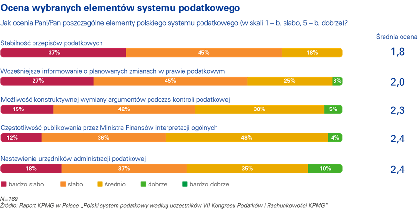 Średnia ocena polskiego systemu podatkowego jest podobna do tej z roku ubiegłego i wynosi 2,2 (w pięciostopniowej skali). Wynik ten jest średni? ocen poszczególnych elementów systemu, spośród których najniżej oceniona została stabilność przepisów podatkowych. Jedyn? kategori?, któr? respondenci ocenili tak samo jak w poprzednim roku jest częstotliwość publikowania przez Ministra Finansów interpretacji ogólnych.