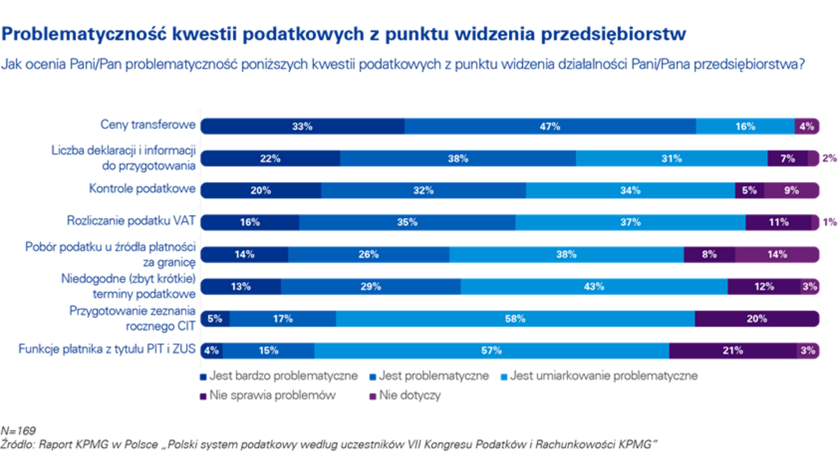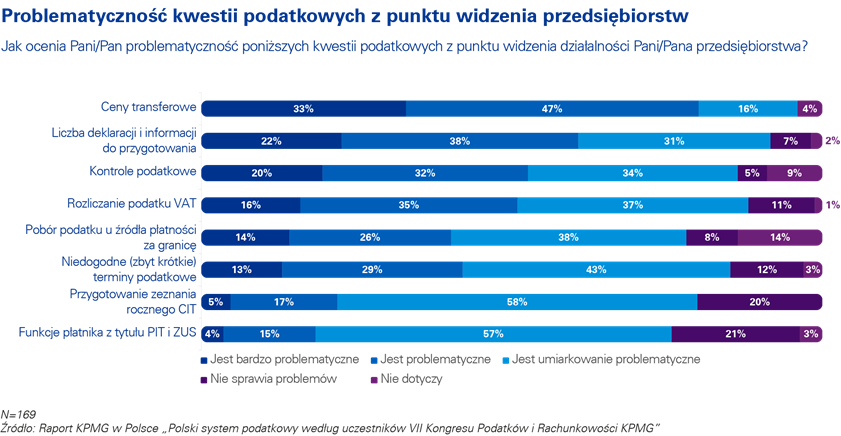 Podobnie jak w poprzednich latach respondenci zadeklarowali, że najbardziej uci?żliw? kwesti? podatkow? z punktu widzenia prowadzenia przedsiębiorstwa s? ceny transferowe (aż 80% ankietowanych uznało je za problematyczne lub bardzo problematyczne), jak również wymóg przygotowania dużej liczby deklaracji i informacji w ramach rozliczeń podatkowych (60%). Relatywnie najmniej kłopotliwe s? funkcje płatnika z tytułu PIT i ZUS. Co pi?ty respondent uważa, że nie wi?ż? się one z komplikacjami, a dla 57% obowi?zki te s? tylko umiarkowanie problematyczne.