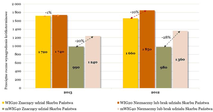Jak wynika z tegorocznego badania, różnica pomiędzy poziomem wynagrodzenia w spółkach z udziałem Skarbu Państwa (powyżej 25% akcjonariatu) a sektorem prywatnym w przypadku spółek z WIG20 praktycznie przestała istnieć, a dla WIG40 zmniejszyła się do 20%.
