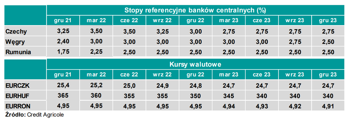 Perspektywy inflacyjne wyglądają podobnie we wszystkich krajach regionu. Obecnie inflacja w każdym z nich kształtuje się znacząco powyżej górnej granicy odchyleń od celu inflacyjnego banku centralnego. Szybki wzrost cen wspierany jest przez efekty niskiej bazy sprzed roku, ograniczenia podażowe, podwyżki rekompensujące firmom utracone obroty w trakcie lockdownu oraz realizację odłożonego popytu przez gospodarstwa domowe. Dodatkowym czynnikiem proinflacyjnym są wysokie ceny paliw i innych nośników energii. W przypadku każdego kraju oczekujemy, że jeszcze przez kilka miesięcy inflacja pozostanie w trendzie wzrostowym. Następnie, z uwagi na wygasanie wspomnianych wyżej efektów oraz antyinflacyjny wpływ zacieśniania polityki pieniężnej, inflacja zacznie się obniżać. W przeciwieństwie do Polski, rządy innych krajów regionu nie wprowadziły działań na wzór Tarczy Antyinflacyjnej polegających na obniżce stawki akcyzy i podatku od paliw i nośników energii. Rząd Rumunii uchwalił natomiast rekompensaty za zużycie gazu i prądu, jednak są one neutralne z punktu widzenia inflacji, gdyż nie mają one wpływu na poziom cen. Prognozujemy, że inflacja wyniesie średniorocznie 5,5% w Czechach oraz 7,2% w przypadku Rumunii i 4,9% na Węgrzech, a w 2023 r. obniży się do odpowiednio 2,5%, 3,8% i 3,0%.