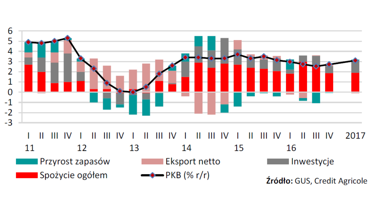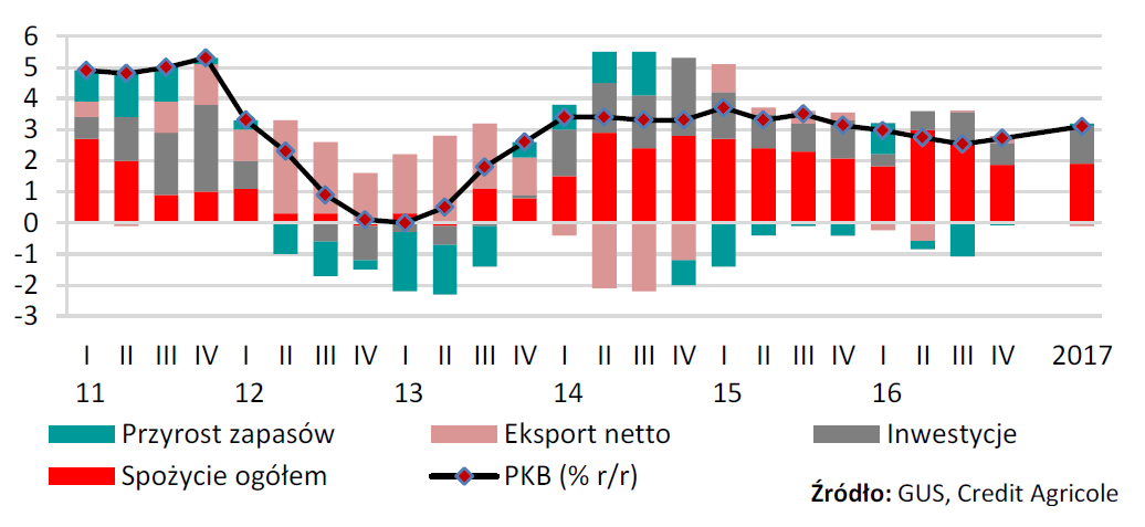 Od II kw. 2017 r. pozytywny efekt oddziaływania programu 500+ na dynamikę konsumpcji wygaśnie, a dodatkowo wysokie efekty bazy z 2016 r. będ? oddziaływały w kierunku zmniejszenia tempa wzrostu spożycia prywatnego i dynamiki PKB w 2017 r. W przeciwnym kierunku będzie natomiast oddziaływała zwiększona absorbcja środków unijnych przyczyniaj?ca się do wzrostu inwestycji ogółem. W 2017 r. nast?pi również zwiększenie dynamiki inwestycji przedsiębiorstw wspierane przez efekty niskiej bazy z 2016 r.