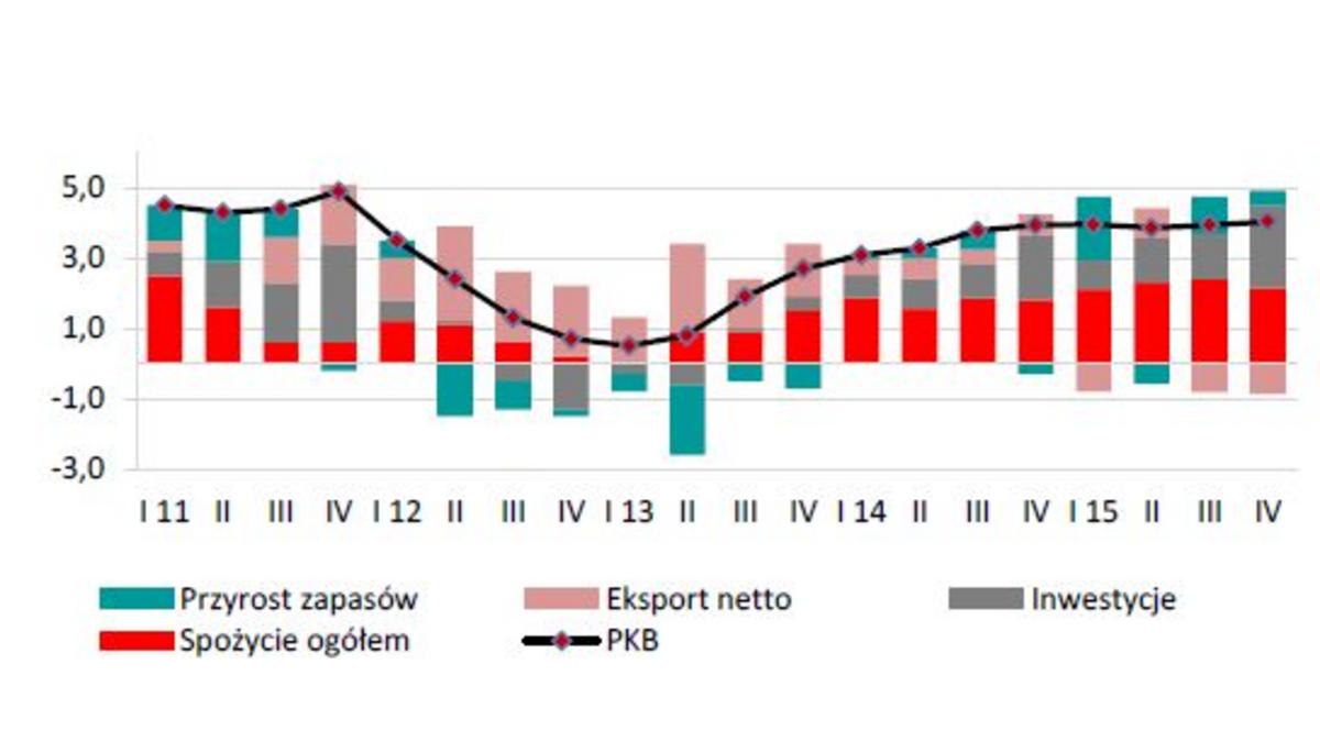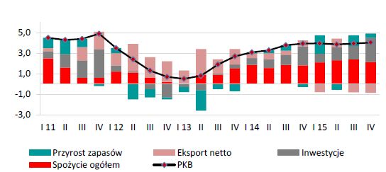 Głównym źródłem silniejszego wzrostu polskiej gospodarki w latach 2014-2015 będzie wyższa dynamika popytu krajowego, wynikaj?ca z ożywienia zarówno konsumpcji, jak i inwestycji. W kierunku przyśpieszenia konsumpcji będ? oddziaływały utrzymuj?ca się relatywnie niska inflacja, wysoka dostępność kredytów konsumpcyjnych oraz poprawa sytuacji na rynku pracy (oczekujemy, że stopa bezrobocia będzie spadała szybciej niż wcześniej zakładaliśmy). Wzrost inwestycji ogółem będzie wspierany przede wszystkim przez przyśpieszenie inwestycji przedsiębiorstw. Odnotowane ożywienie inwestycji w dużych i średnich firmach będzie korzystnie przekładało się na mniejsze przedsiębiorstwa. Wsparciem dla takiego scenariusza jest odnotowane w IV kw. ub. r. silne przyśpieszenie nominalnych inwestycji w przedsiębiorstwach zatrudniaj?cych powyżej 50 osób (do 11,8% r/r z 3,8% w III kw.). Dodatkowym czynnikiem dynamizuj?cym inwestycje sektora MSP w latach 2014-2015 będzie gwarancja de minimis. Naszym zdaniem, dynamika inwestycji publicznych pozostanie ujemna w I kw. br., lekkiego ich ożywienia oczekujemy w II poł. r.
