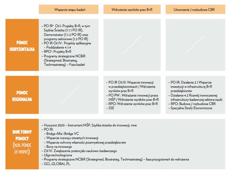 Przedsiębiorcy planuj?cy prace badawczo-rozwojowe mog? uzyskać dofinansowanie na badania, wdrożenie wyników prac B+R lub utworzenie centrum badawczo-rozwojowego (tzw. CBR) w ramach funduszy Unii Europejskiej czy innych form wsparcia takich jak: ulga technologiczna. Czeka na nich również pomoc w ramach unijnego programu Horyzont 2020. Wśród kluczowych czynników, które będ? ocenianie przy projekcie s?: czy dany projekt wpisuje się w Krajow? Inteligentn? Specjalizację, czy własność intelektualna nie stanowi bariery dla wdrożenia rezultatów projektu oraz czy dany projekt jest nowości?.