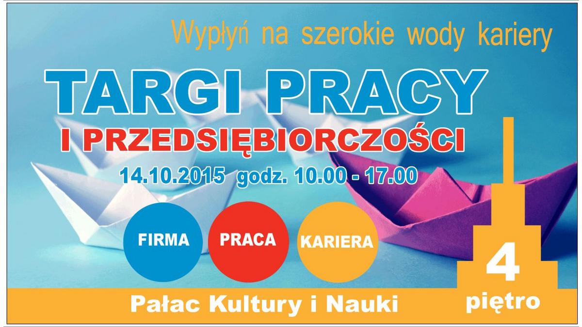 <p style="text-align: justify;"><strong>W dniu 14 października 2015 r., w godzinach 10.00 – 17.00, w salach wystawowych na czwartym piętrze Pałacu Kultury i Nauki w Warszawie, po raz kolejny odbędą się Targi Pracy i Przedsiębiorczości. Targi to niepowtarzalna okazja na spotkanie się osób poszukujących pracy z pracodawcami, a także bogata oferta instytucjonalnego wsparcia dla planujących przygodę z własnym biznesem.</strong></p>
