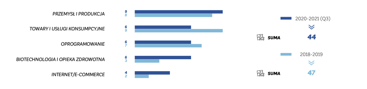 Polscy inwestorzy najczęściej przejmowali za granicą firmy produkcyjne. Co ciekawe, w czasie pandemii widać wyraźny wzrost zagranicznych przejęć w sektorze biotechnologii i e-commerce. Spadło natomiast zainteresowanie firmami z branży dóbr konsumenckich.
