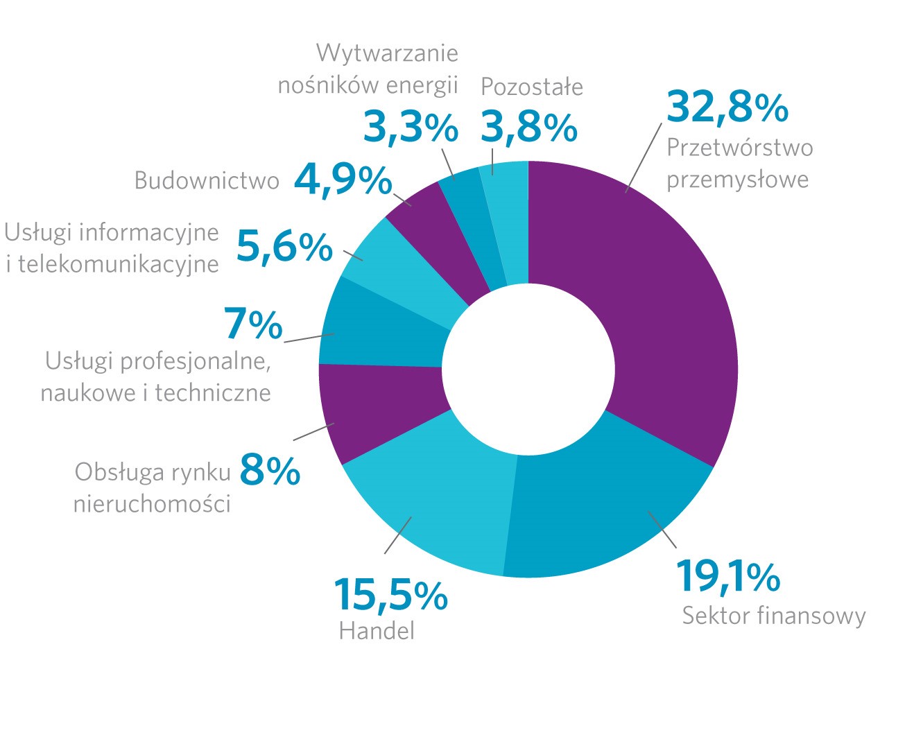 Wykres 2. FDI lokowane w branże na koniec 2015 r. (źródło: NBP)