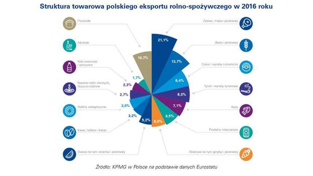 Od 2010 roku saldo handlu zagranicznego produktów rolno-spożywczych wzrosło niemal trzykrotnie, a wpływy z eksportu o prawie 80%. Największ? oraz nominalnie najdynamiczniej rosn?c? kategori? jest żywiec, mięso i przetwory – wartość eksportu produktów z tej kategorii przekroczyła 5 mld euro w 2016 roku (wzrost o 4,2% r/r). Branża mięsna w znacznym stopniu przyczyniła się do całkowitego wzrostu eksportu polskiej żywności – zawdzięczamy jej jedn? pi?t? przyrostu sprzedaży zagranicznej w latach 2010-2016. Drug? największ? wartościowo grup? produktów eksportowych z Polski s? zboża i ich przetwory, których sprzedaż w 2016 roku była równa 3,3 mld euro.