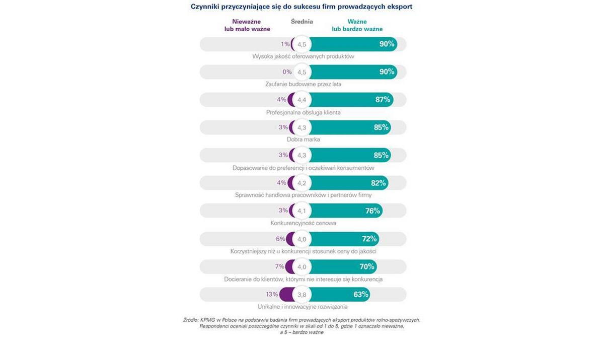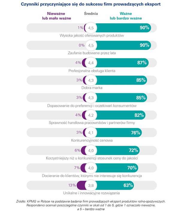 Jak wynika z badania firmy doradczej KPMG, ponad połowa firm jest zadowolona z odniesionego sukcesu eksportowego. Zdaniem producentów i dystrybutorów do sukcesu na rynkach zagranicznych przyczyniaj? się przede wszystkim wysoka jakość oferowanych produktów, a także długotrwałe relacje biznesowe oraz profesjonalna obsługa klientów. Niemal co drugi badany przedsiębiorca (47%) twierdzi, że polskie pochodzenie żywności jest czynnikiem wpływaj?cym na jej korzyść, przeciwnego zdania jest jedynie 11% ankietowanych. Budowanie świadomości marki „Polska” i pozycjonowanie polskiej żywności ważne jest szczególnie na rynkach, na których obecnych jest jeszcze niewiele krajowych firm.