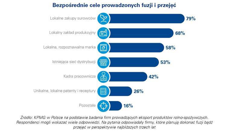 Prawie 8 na 10 przedsiębiorstw planuj?cych fuzje lub przejęcia w najbliższej perspektywie jako bezpośredni cel tych działań wskazuje na dostęp do lokalnych zakupów surowców. Dla większości firm istotne jest ponadto przejęcie lokalnego zakładu produkcyjnego (68%) oraz wejście w posiadanie lokalnej, rozpoznawalnej marki (58%). Nie bez znaczenia okazał się także motyw zwi?zany z przejęciem kanałów dystrybucji na zagranicznym rynku, wskazany przez 53% przedsiębiorstw objętych badaniem – mówi Piotr Grauer, dyrektor w grupie Deal Advisory w KPMG w Polsce.