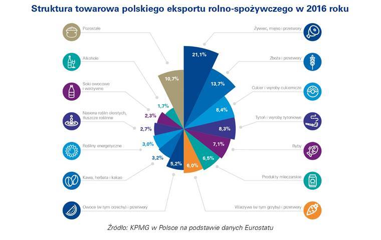 <p style="text-align: justify;" align="justify"><span style="color: #000000;"><span style="font-family: 'Trebuchet MS', sans-serif;"><strong>W 2016 roku wpływy z polskiego eksportu produktów rolno-spożywczych wyniosły rekordowe 24,1 mld euro. Udział eksportu rolno-spożywczego w polskim handlu zagranicznym ogółem wyniósł ponad 13%, a nadwyżka generowana przez ten sektor ma duży wpływ na wyniki całościowe handlu. Jak wynika z najnowszego badania firmy KPMG, ponad połowa firm jest zadowolona z odniesionego sukcesu eksportowego, a blisko co drugi badany przedsiębiorca twierdzi, że polskie pochodzenie żywności jest czynnikiem wpływającym na jej korzyść. Istotnym elementem ekspansji zagranicznej polskich producentów są fuzje i przejęcia – 18% firm planuje aktywność w tym obszarze w ciągu najbliższych 3 lat.</strong></span></span></p>