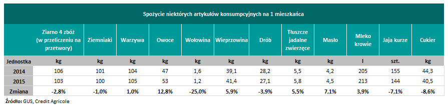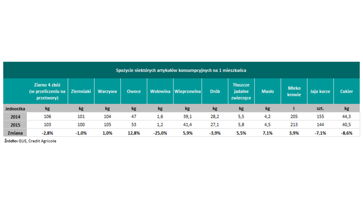 W strukturze danych warto zwrócić uwagę również na kontynuację wzrostu spożycia owoców (wzrost o 12,8% do 53 kg) i warzyw (wzrost o 1,0% do 105 kg). Jednocześnie utrzymuje się trend wzrostowy konsumpcji bilansowej mleka (wzrost o 3,9% do 213 l) i masła (wzrost o 7,1% do 4,5 kg).