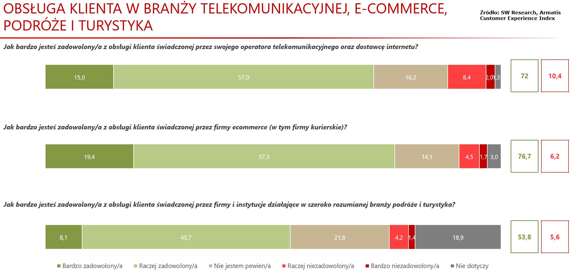 „Nasze badanie pokazało minimalnie gorsze wyniki satysfakcji z obsługi klienta w branży telekomunikacyjnej. Odsetek osób zadowolonych z obsługi przez ich operatora telekomunikacyjnego lub dostawcę internetu sięga 72%, a osób niezadowolonych jest 6%. Za to wyraźnie odstaje w tym rankingu branża turystyka i podróże, gdzie tylko niewiele ponad połowa badanych (54%) wskazuje zadowolenie, a odsetek osób niezadowolonych sięga niemal 6%” – komentuje Krzysztof Lewiński z Armatis.