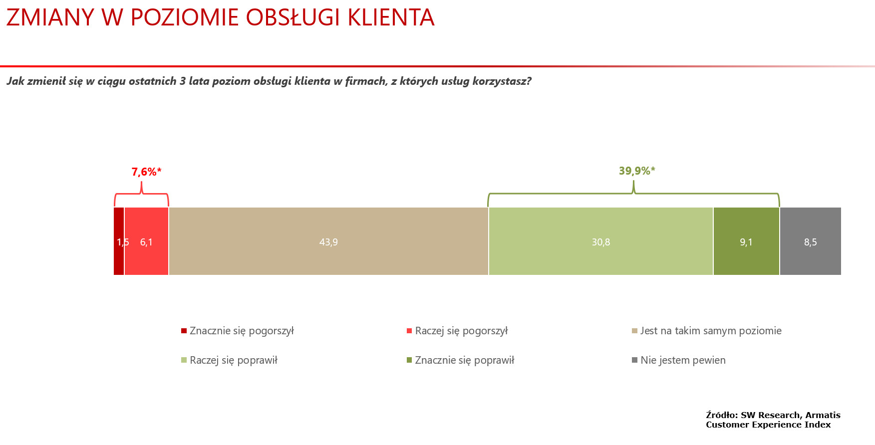 Wyniki badania pokazały, że więcej niż cztery osoby na dziesięć (44%) są zdania, że poziom obsługi klienta w firmach, z których usług korzystają, nie zmienił się w ciągu ostatnich 3 lat. Nieco mniejszy odsetek (40%) wskazuje, że zauważył poprawę w poziomie obsługi klienta (znacznie – 9%, raczej – 31%). Rzadziej niż co dziesiąta osoba uważa, że obsługa klienta w firmach, z których usług korzystają pogorszyła się (znacznie – 2%, raczej – 6%).