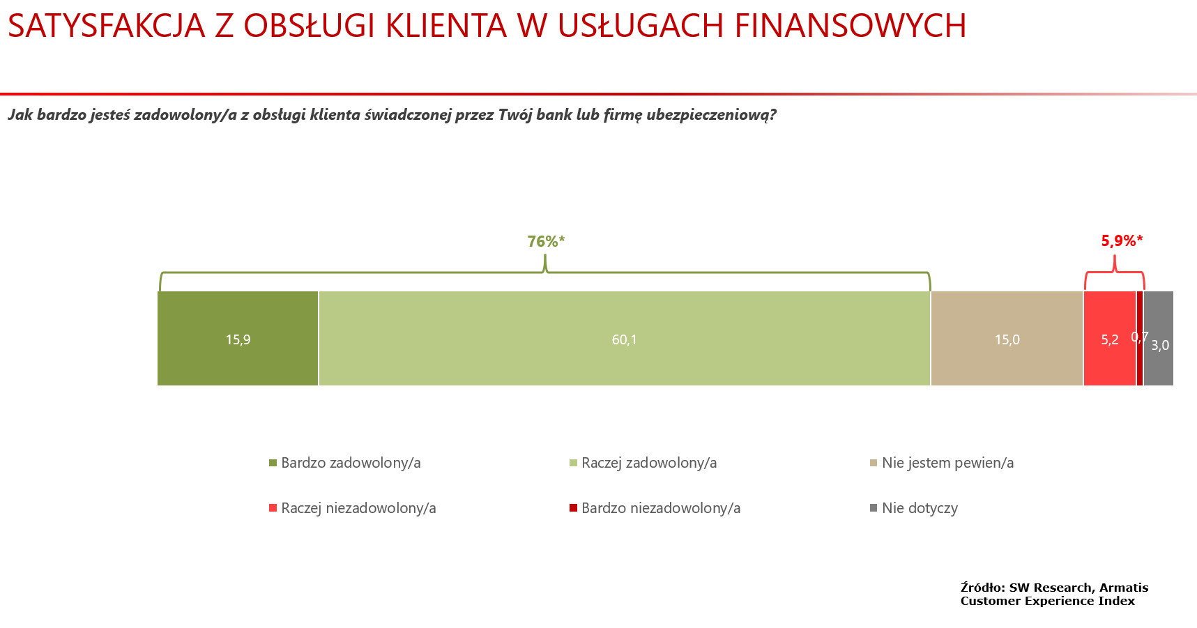 Trzy czwarte badanych (76%) deklaruje z kolei, że jest zadowolonych z obsługi klienta świadczonej przez swój bank lub firmę ubezpieczeniową (bardzo – 16%, raczej – 60%). Niemal 6% respondentów jest raczej (5%) lub bardzo niezadowolonych (1%) z obsługi w tego typu placówkach.