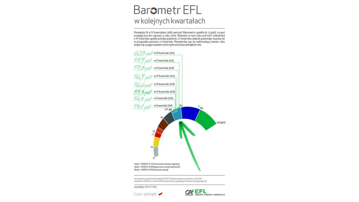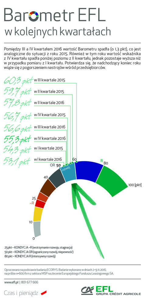 https://secure.netpr.pl/#_ftnref1[1]„Barometr EFL” jest syntetycznym wskaźnikiem informuj?cym o skłonności firm z sektora MŚP do wzrostu (tj. rozwoju rozumianego, jako stawianie sobie przez przedsiębiorstwa celów zwi?zanych ze wzrostem sprzedaży i produkcji, ekspansj? na nowe rynki i maksymalizacj? zysków, co jest zwi?zane z inwestycjami w środki trwałe). Prognozowana na dany kwartał kondycja finansowa firm MŚP daje punkt odniesienia do wnioskowania o zakładanym kierunku zmian, które sprzyjaj? wzrostowi lub działaj? hamuj?co na rozwój firm. Badanie przygotowywane jest przez Ecorys na zlecenie Europejskiego Funduszu Leasingowego SA., a jego wyniki s? publikowane co kwartał. Jego uczestnicy to mikro, małe i średnie firmy terenu całej Polski. W badaniu wzięła udział reprezentatywna grupa 600 mikro, małych i średnich firm. Aktualna edycja badania odbyła się w dniach 2 – 9.11.2016 r.