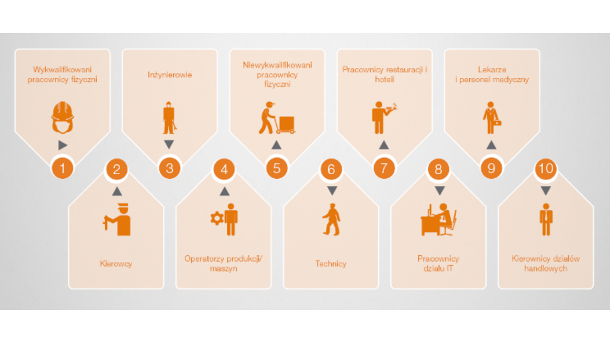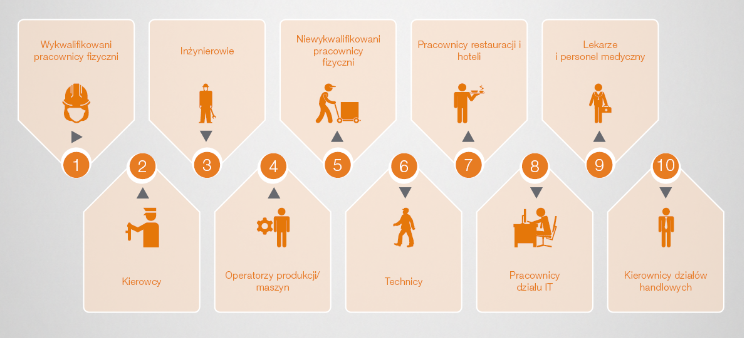 Niezmiennie od kilku kolejnych lat, grup? zawodow?, której przedstawicieli znaleźć jest najtrudniej s? wykwalifikowani pracownicy fizyczni. Do puli tej należ? m.in. mechanicy, elektrycy, spawacze, monterzy, operatorzy wózków widłowych, murarze, drukarze, stolarze czy tokarze. Na drugim miejscu znaleźli się kierowcy, a zaraz za nimi inżynierowie, którzy zamykaj? pierwsz? trójkę. Na kolejnym miejscu uplasowali się operatorzy produkcji/ maszyn. Zestawienie pokazuje też, że nie w każdej sytuacji kompetencje s? najważniejszym czynnikiem poszukiwań. Liczy się również zaangażowanie i chęć do pracy, czego dowodem jest pozycja pi?ta i umieszczeni na niej niewykwalifikowani pracownicy fizyczni. O pracowników ciężko również na stanowiskach techników z różnych obszarów, a także personelu rozwijaj?cego się ci?gle sektora restauracje i hotele, zajmuj?cych odpowiednio miejsca szóste i siódme. Otoczeni stereotypem najtrudniejszych do znalezienia, pracownicy działów IT znaleźli się dopiero na ósmej pozycji. Natomiast przedostatnie miejsce zajęli lekarze i personel medyczny. Dziesi?tkę grup zawodowych obarczonych największym niedoborem talentów zamykaj? kierownicy działów handlowych. Utrzymanie się popytu na tych pracowników jest też potwierdzeniem tego, że rynek staje się coraz bardziej konkurencyjny, a o przewadze decyduj? nie tylko produkty, ale też potencjał sprzedażowy firm.