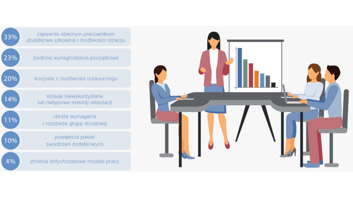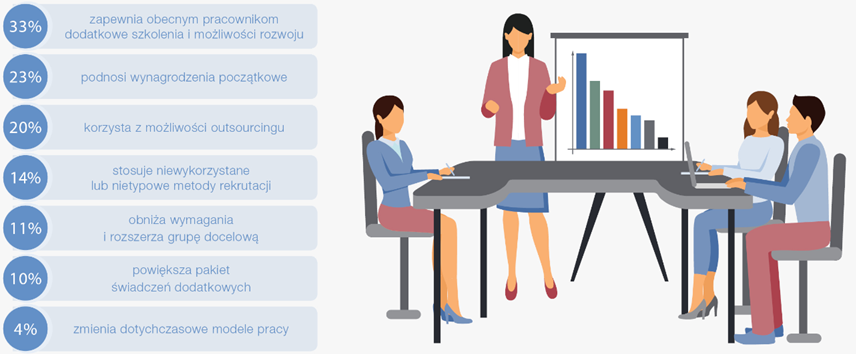 W badaniu ManpowerGroup zapytano również menedżerów HR na całym świecie o strategie podejmowane w obliczu niedoboru talentów. Blisko połowa firm w Polsce (33%) i ponad jedna trzecia organizacji w ujęciu globalnym (53%) próbuje uporać się z problemem wdrażaj?c nowe praktyki HR, takie jak dodatkowe szkolenia i możliwość rozwoju dla obecnych pracowników. Pracodawcy w naszym kraju chętniej podwyższaj? też stawki wynagrodzeń (23%) i sięgaj? po wsparcie u wyspecjalizowanych firm doradztwa personalnego (20%). Poszukuj? również nowych, sposobów rekrutacji (14%). Korzystaj? też z nowych metod docierania do kandydatów oraz rozszerzaj? kryteria rekrutacji, aby uwzględnić osoby, którym brakuje niektórych wymaganych umiejętności lub kwalifikacji, ale posiadaj? potencjał do ich zdobycia (11%).