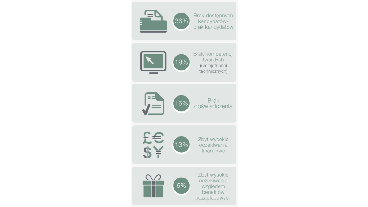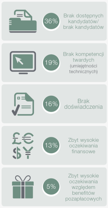W badaniu ManpowerGroup respondenci wskazywali również przyczyny niedoboru talentów. Ważne znaczenie, dla wszystkich ankietowanych, maj? czynniki środowiskowe i organizacyjne. Aż co trzeci badany wskazał w tym obszarze na brak dostępnych kandydatów (36%). Istotnym wyzwaniem okazał się być też brak kompetencji twardych, czyli umiejętności technicznych (19%), a następnie brak doświadczenia (16%). Co ciekawe, na zbyt wysokie oczekiwania finansowe wskazało jedynie 13% badanych. 5%, jako powód problemów w pozyskaniu pracowników, podało też zbyt duże oczekiwania względem benefitów pozapłacowych. W 11. edycji badania ManpowerGroup „Niedobór talentów” wzięło udział ponad 42 000 respondentów z 43 krajów, w tym reprezentatywna grupa 750 z Polski. Ankietowani to osoby odpowiedzialne za politykę personaln? w małych, średnich i dużych firmach. Celem powadzonego przez ManpowerGroup corocznego badania przedsiębiorców „Niedobór talentów” jest określenie ich trudności w pozyskiwaniu pracowników a także sprawdzenie które zawody, i dlaczego, jest najtrudniej obsadzić.