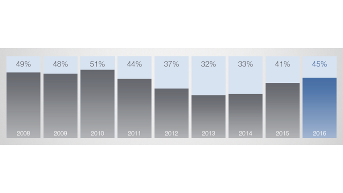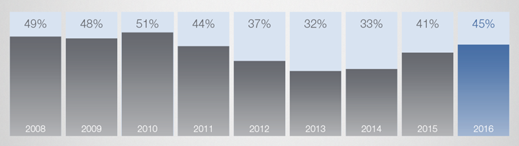 Rys. 1. Narastanie zjawiska niedoboru talentów w Polsce. Źródło: Raport „Niedobór talentów” ManpowerGroup.