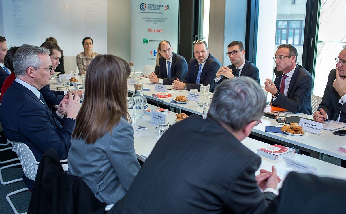 Francuski Minister Gospodarki i Finansów, Bruno Le Maire spotkał się w poniedziałek rano w siedzibie Francusko-Polskiej Izby Gospodarczej z delegacją firm francuskich operujących na polskim rynku oraz przedsiębiorcami stowarzyszonych w CCIFP. Spotkanie było okazją do omówienia najważniejszych bieżących zagadnień z obszaru francusko-polskiej współpracy ekonomicznej i dyskusji na temat kierunku rozwoju biznesowej działalności francuskich przedsiębiorstw na terenie Polski, w kontekście strategii gospodarczej obu krajów oraz planowanych inwestycji.