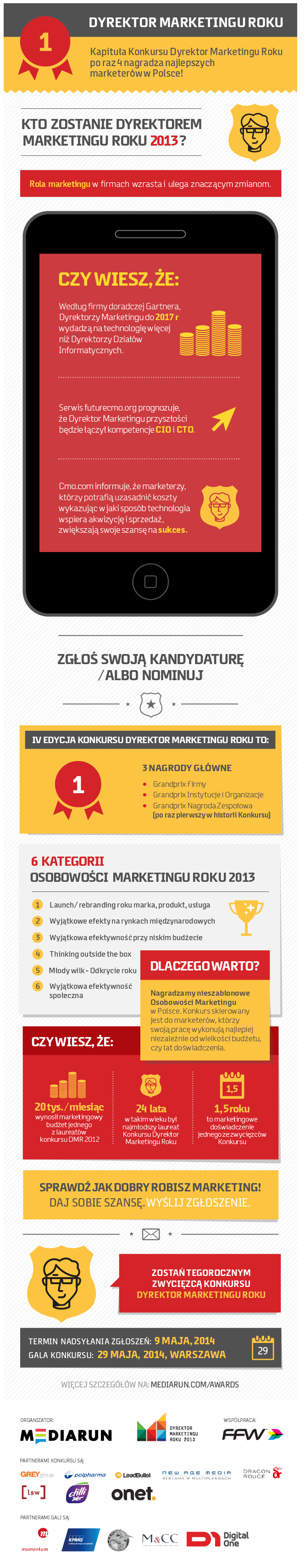 O statuetkę Dyrektora Marketingu Roku mog? ubiegać się osoby kieruj?ce działaniami marketingowymi i komunikacyjnymi w przedsiębiorstwach, instytucjach oraz organizacjach pozarz?dowych, wypełniaj?c formularz zawarty na dedykowanej stronie http://www.mediarun.com/awards/.