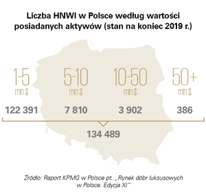 134 tys. wynosi liczba osób mieszkających w Polsce, zaliczanych do grupy HNWI (ang. high net worth individuals), których majątek netto przekracza wartość 1 mln dolarów. W rankingu analizowanych państw Europy z największą liczbą milionerów Polska wyprzedziła Portugalię, Grecję oraz Finlandię. W strukturze Polaków zaliczających się do grupy HNWI dominują osoby z majątkiem pomiędzy 1 a 5 mln dolarów, których jest ponad 122 tys. Z kolei 386 osób posiada majątek przekraczający 50 mln dolarów. W całej Europie na koniec 2019 roku liczba milionerów wyniosła 13,5 mln osób, z czego najwięcej HNWI mieszka w Wielkiej Brytanii, Francji oraz Niemczech.