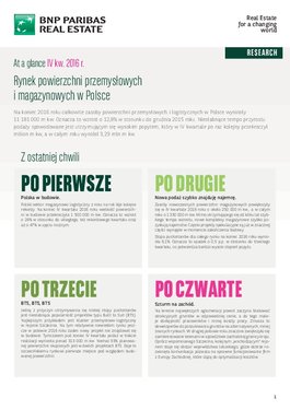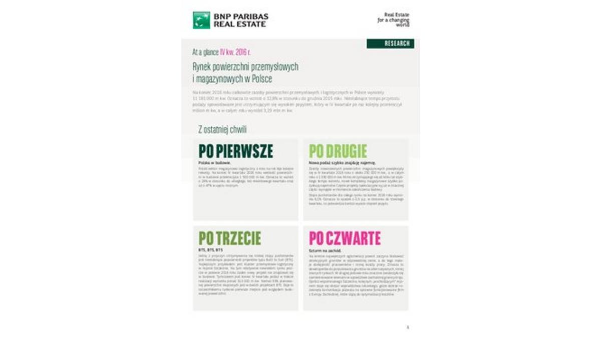 <p style="text-align: justify;">Według najnowszego raportu <em>At a Glance – Industrial (Q4 2016)</em>, ostatni kwartał minionego roku na rynku powierzchni magazynowych i logistycznych stał pod znakiem utrzymującego się na wysokim poziomie popytu, który po raz kolejny przekroczył milion m kw w ostatnim kwartale, a w całym roku wyniósł 3,29 mln m kw. Na koniec 2016 roku całkowite zasoby powierzchni logistycznych i magazynowych w Polsce wynosiły 11,181 mln m kw., co oznacza wzrost podaży o 12,8 proc. r/r.</p>