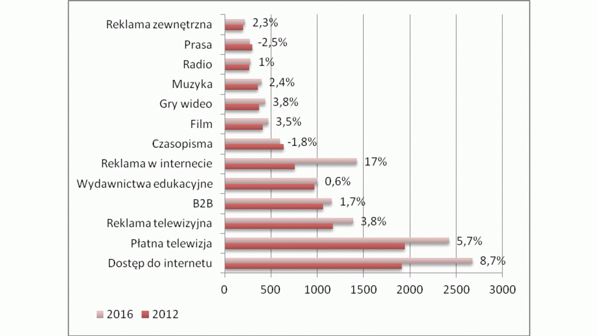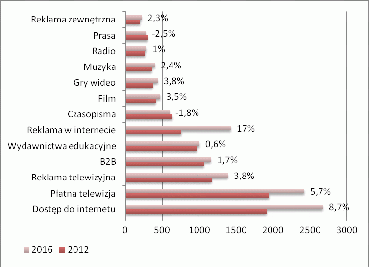 Patrz?c z perspektywy udziału poszczególnych segmentów rynku mediów w całkowitych wydatkach konsumenckich na przestrzeni lat 2011-2016, w Polsce widać wyraźny wzrost wydatków na dostęp do Internetu (w tym głównie mobilnego) oraz reklamę w Internecie. Odbędzie się to kosztem wydatków na stacjonarny dostęp do Internetu, wydatków na ksi?żki (zwłaszcza dystrybuowane w modelu tradycyjnym) oraz na zakup czasopism.