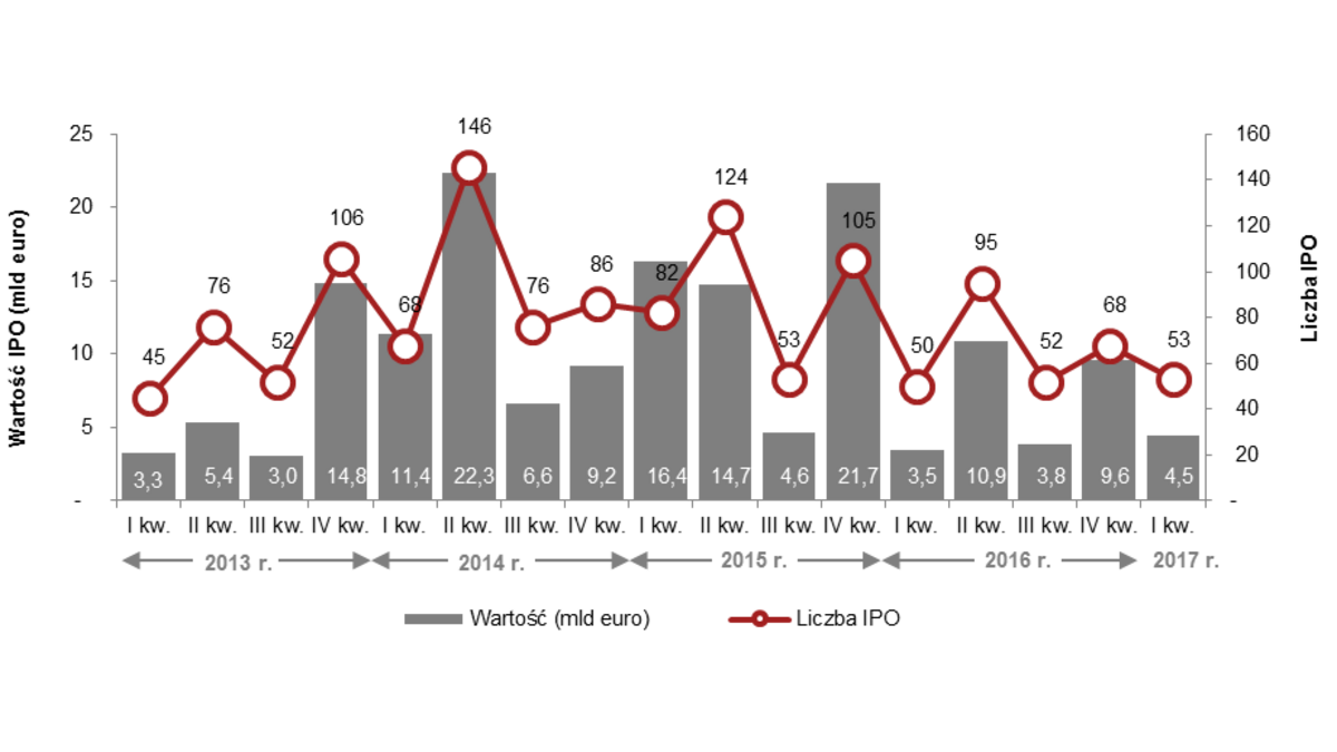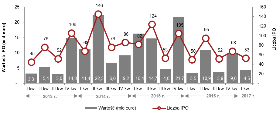 <p style="text-align: justify;" align="justify"><strong>Wartość ofert pierwotnych (Initial Public Offering – IPO) w Europie w pierwszym kwartale 2017 roku wyniosła 4,5 mld euro – to wzrost w porównaniu do analogicznego okresu 2016 r. (3,5 mld euro) – wynika z najnowszego raportu „IPO Watch Europe” przygotowanego przez firmę doradczą PwC. Nieznacznie wzrosła również liczba debiutów (53 spółki). Na giełdzie w Warszawie w minionym kwartale odnotowano zaledwie 2 oferty – obie na rynku NewConnect.</strong></p>