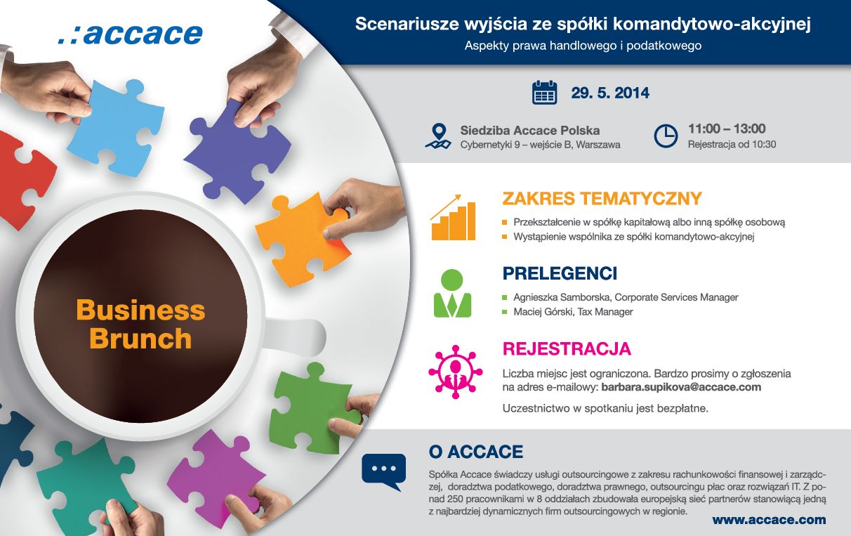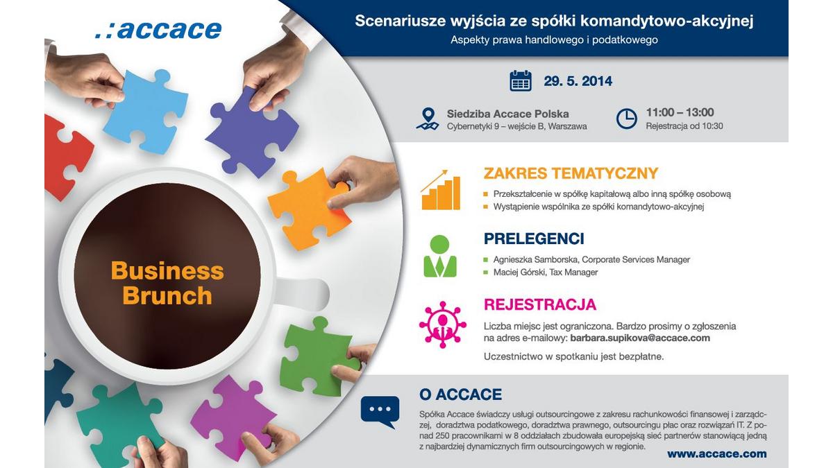 <p style="text-align: justify;"><span style="font-size: small;">Firma ACCACE serdecznie Państwa zaprasza na Business Brunch<strong><em> "</em></strong><em><strong>Scenariusze wyjścia ze spółki komandytowo-akcyjnej</strong>.</em>"</span></p> <p style="text-align: justify;"><span style="font-size: small;">Spotkanie odbędzie się <strong>29 maja 2014 r. </strong>w siedzibie naszej firmy, przy ulicy Cybernetyki 9 - wejście B, (11:00 – 13:00).</span></p> <p style="text-align: justify;"><span style="font-size: small;">Business Brunch jest skierowany do zarządu, dyrektorów finansowych, głównych księgowych, oraz osób odpowiedzialnych za kwestie podatkowe w Państwa firmie. <strong>Uczestnictwo w spotkaniu jest bezpłatne.</strong></span></p> <p style="text-align: justify;"><span style="font-size: small;">Liczba miejsc jest ograniczona, dlatego prosimy o zgłoszenia pod adres: <a href="mailto:barbara.supikova@accace.com">barbara.supikova@accace.com</a></span></p>