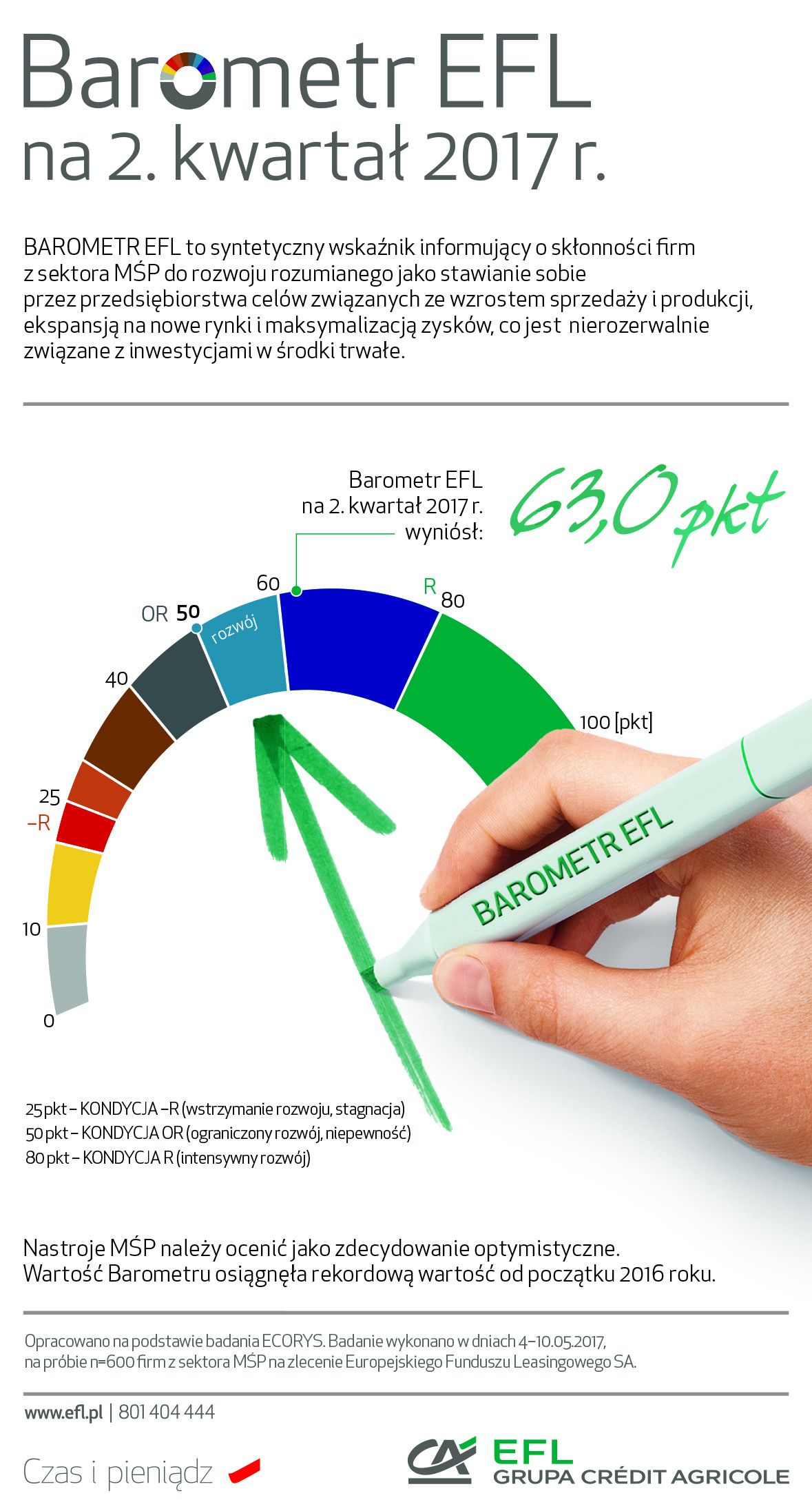 https://secure.netpr.pl/#_ftnref1[1] „Barometr EFL” jest syntetycznym wskaźnikiem informuj?cym o skłonności firm z sektora MŚP do wzrostu (tj. rozwoju rozumianego, jako stawianie sobie przez przedsiębiorstwa celów zwi?zanych ze wzrostem sprzedaży i produkcji, ekspansj? na nowe rynki i maksymalizacj? zysków, co jest zwi?zane z inwestycjami w środki trwałe). Prognozowana na dany kwartał kondycja finansowa firm MŚP daje punkt odniesienia do wnioskowania o zakładanym kierunku zmian, które sprzyjaj? wzrostowi lub działaj? hamuj?co na rozwój firm. Badanie przygotowywane jest przez Ecorys na zlecenie Europejskiego Funduszu Leasingowego SA., a jego wyniki s? publikowane co kwartał. Jego uczestnicy to mikro, małe i średnie firmy terenu całej Polski. W badaniu wzięła udział reprezentatywna grupa 600 mikro, małych i średnich firm. Aktualna edycja badania odbyła się w dniach 4-10 maja 2017 r.