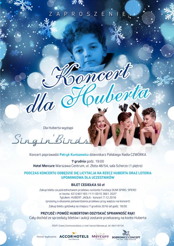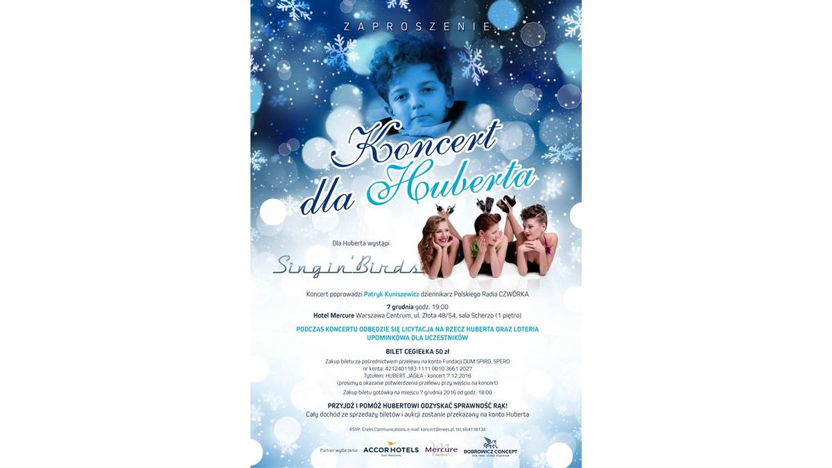 <p style="text-align: justify;" align="center"><strong>Serdecznie z całego serca zapraszam na </strong><strong>Świąteczny Koncert charytatywny dla Huberta</strong>. Koncert odbędzie się<strong> 7 grudnia br. (czwartek), o godz. 19.00, w hotelu Mercure Centrum, ul Złota 48/54.</strong></p>
